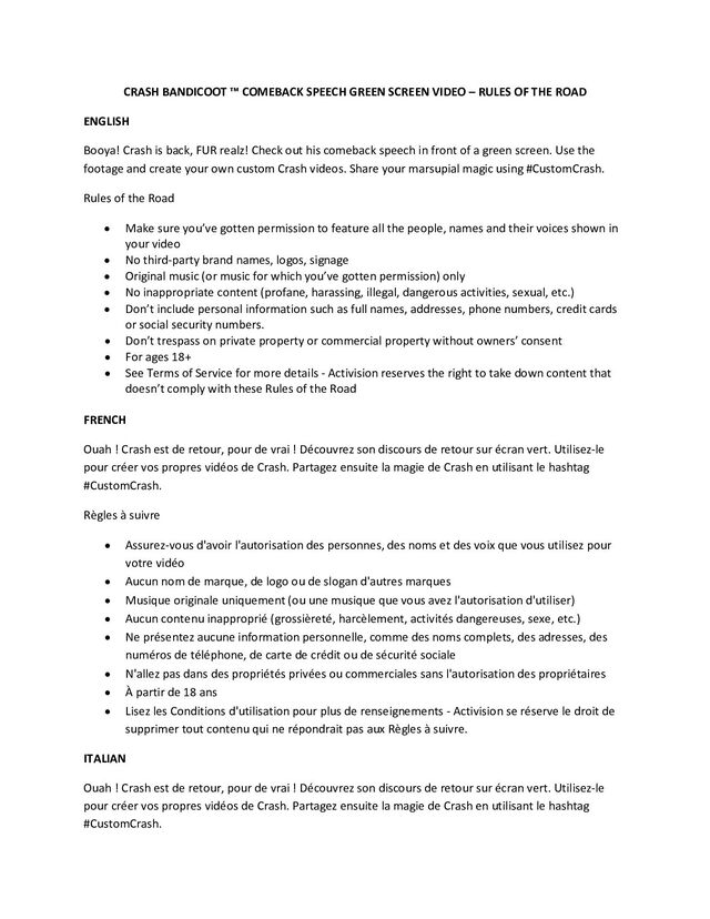 le persone, nomi e voci che appaiono nel tuo video • Sono vietati nomi, logo e simboli di terze parti • Solo musica originale (o musica per cui hai ottenuto il permesso) • Nessun contenuto inappropriato (profanità, molestie, contenuti illegali, attività pericolose, sessuali, ecc.) • Non includere informazioni personali come nomi completi, indirizzi, numeri di telefono o dati di carte di credito • Non invadere proprietà private senza il permesso del proprietario • Solo per maggiori di 18 anni • Per maggiori informazioni consulta i termini di servizio. Actvision si riserva il diritto di rimuovere qualsiasi contenuto non conforme a questo Codice della strada. GERMAN Booya! Crash ist zurück, in echt jetzt! Sieh dir seine Comeback-Ansprache vor einem Greenscreen an. Benutze Videoaufnahmen und erstelle deine eigenen Crash-Videos. Teile deine Beuteltier-Magie mit #CustomCrash. Straßenverkehrsordnung • Sorge dafür, dass du die Erlaubnis hast, alle Leute, Namen und ihre Stimmen zu veröffentlichen, die in deinem Video auftauchen • Keine Markenamen, Logos oder Schilder von Drittanbietern • Nur Original-Musik (oder Musik, für die du die Erlaubnis eingeholt hast) • Keine unangemessenen Inhalte (profan, belästigend, illegal, gefährliche Aktivitäten, sexuell, etc.) • Baue keine persönlichen Informationen wie vollständige Namen, Adressen, Telefonnummern, Kreditkarten oder Sozialversicherungsnummern in das Video ein • Kein unbefugtes Betreten von Privat- oder Geschäftsgrundstücken ohne die Erlaubnis der Besitzer • Altersbeschränkung 18+ • Weitere Informationen in den Nutzungsbedingungen - Activision behält sich das Recht vor, Inhalte zu entfernen, die gegen diese Straßenverkehrsordnung verstoßen. SPANISH ¡Genial! ¡Crash ha vuelto y va en serio! Echa un vistazo a su discurso de regreso frente a un croma. Usa las imágenes para crear tus vídeos personalizados con Crash. Comparte tu magia marsupial con #CustomCrash. Normas