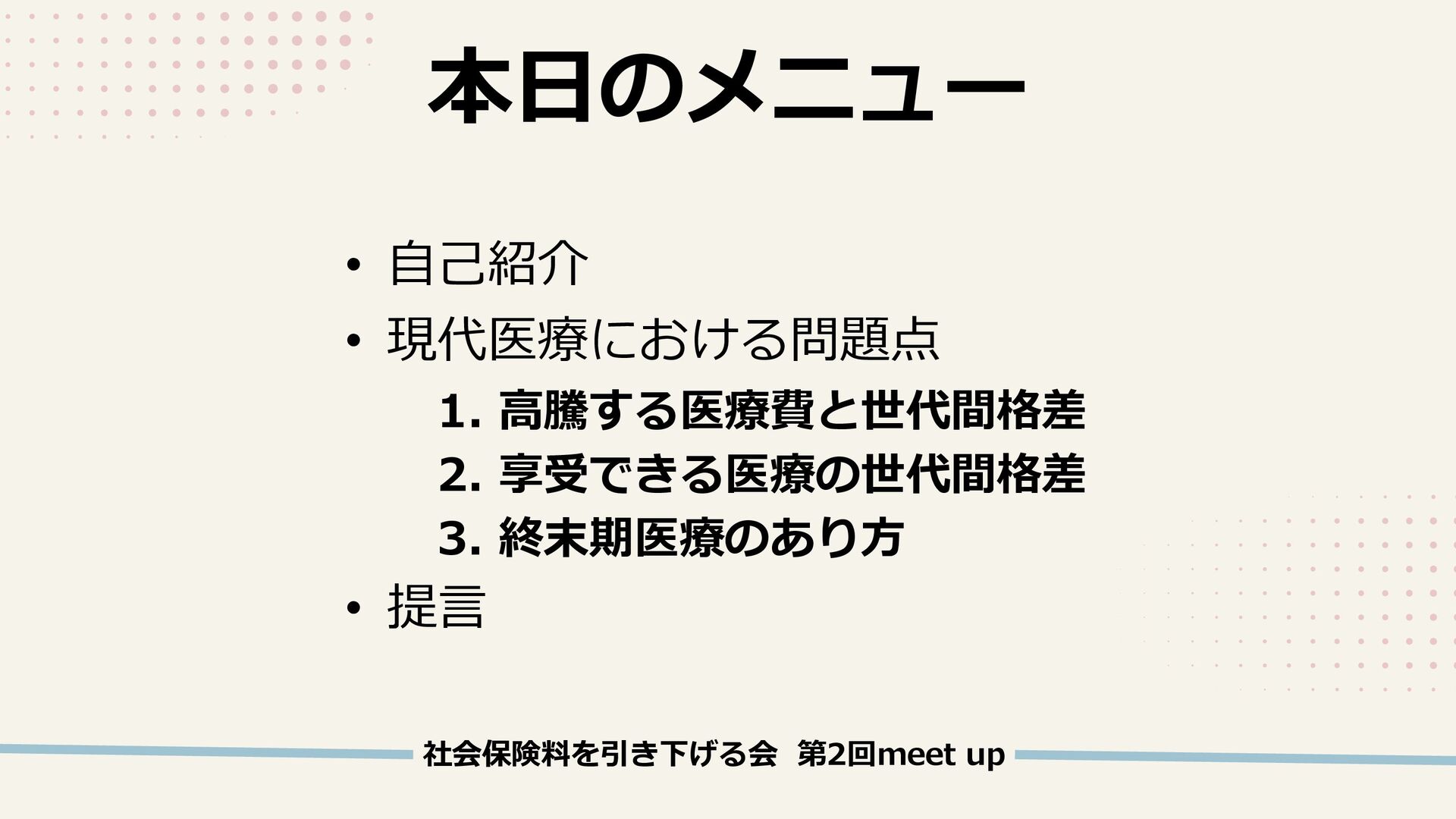 • 自己紹介 • 現代医療における問題点 1. 高騰する医療費と世代間格差 2. 享受できる医療の世代間格差 3. 終末期医療のあり方