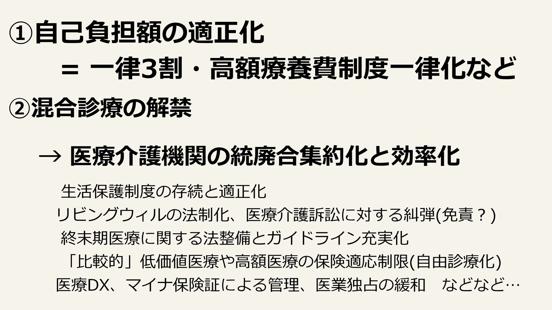①自己負担額の適正化 = 一律3割・高額療養費制度一律化など ②混合診療の解禁 → 医療介護機関の統廃合集約化と効率化 生活保護制度の存続と適正化 リビングウィルの法制化、医療介護訴訟に対する糾弾(免責?) 終末期医療に関する法整備とガイドライン充実化 「比較的」低価値医療や高額医療の保険適応制限(自由診療化)
