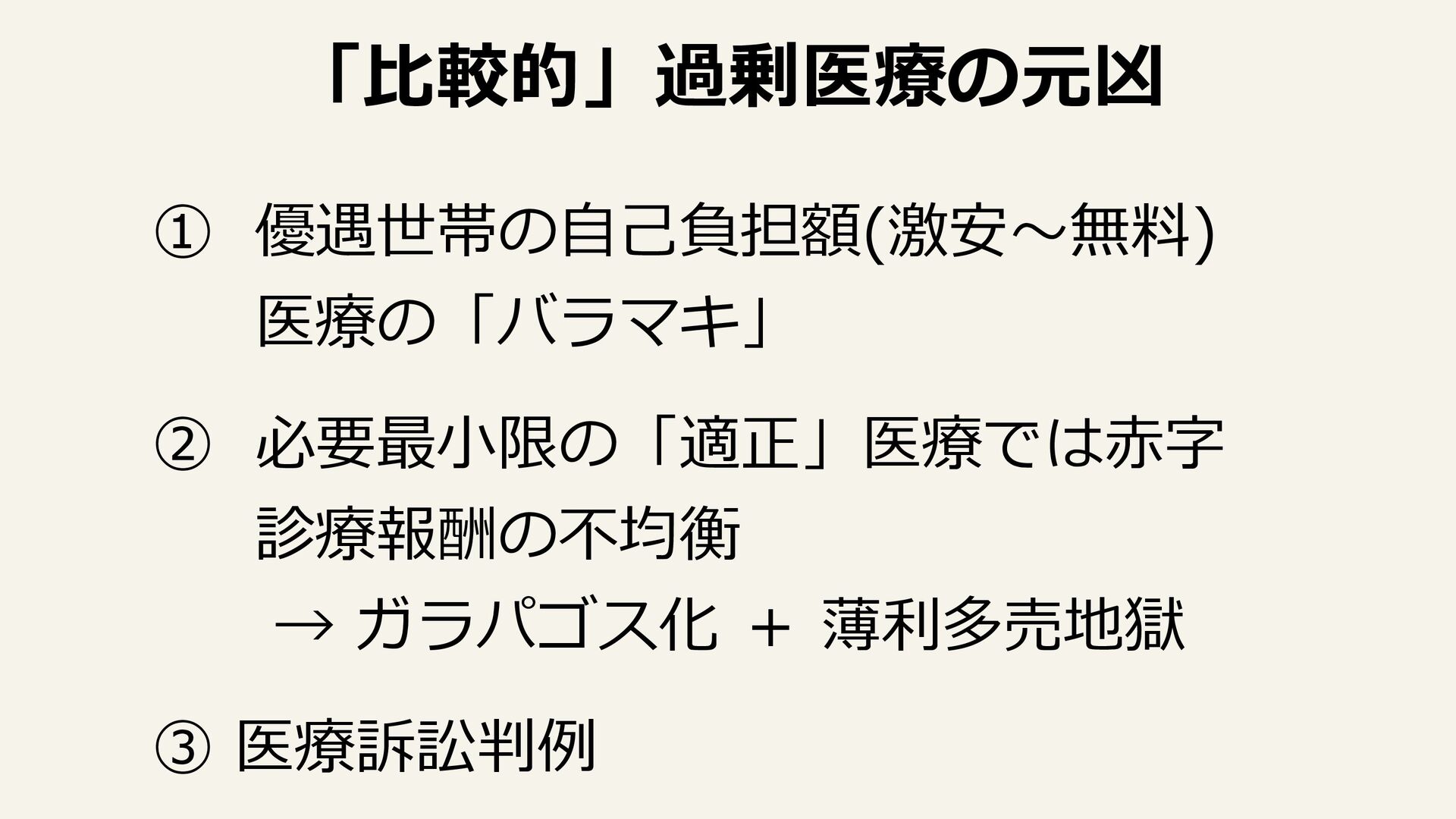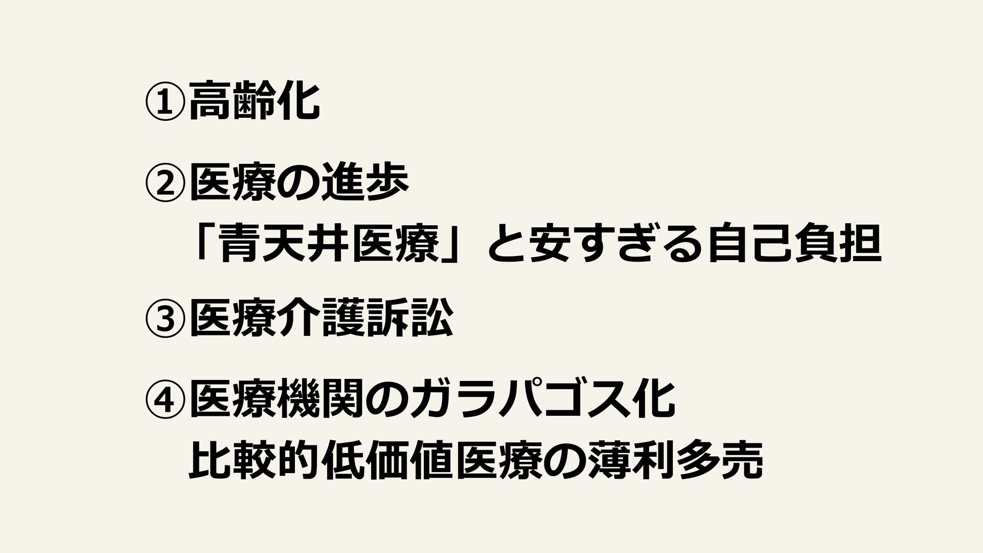 ①高齢化 ②医療の進歩 「青天井医療」と安すぎる自己負担 ③医療介護訴訟 ④医療機関のガラパゴス化 比較的低価値医療の薄利多売