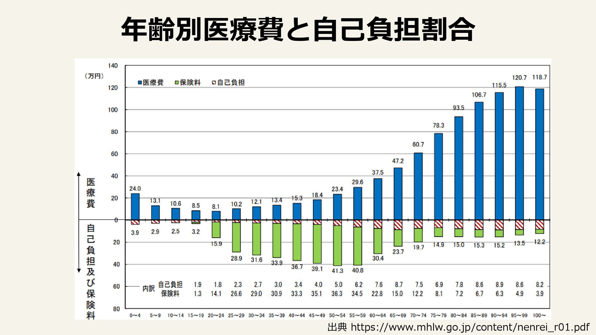年齢別医療費と自己負担割合 出典 https://www.mhlw.go.jp/content/nenrei_r01.pdf