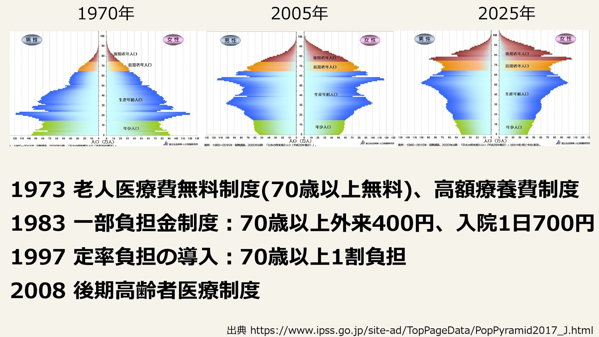 1973 老人医療費無料制度(70歳以上無料)、高額療養費制度 1983 一部負担金制度:70歳以上外来400円、入院1日700円 1997 定率負担の導入:70歳以上1割負担 2008 後期高齢者医療制度 1970年 2005年