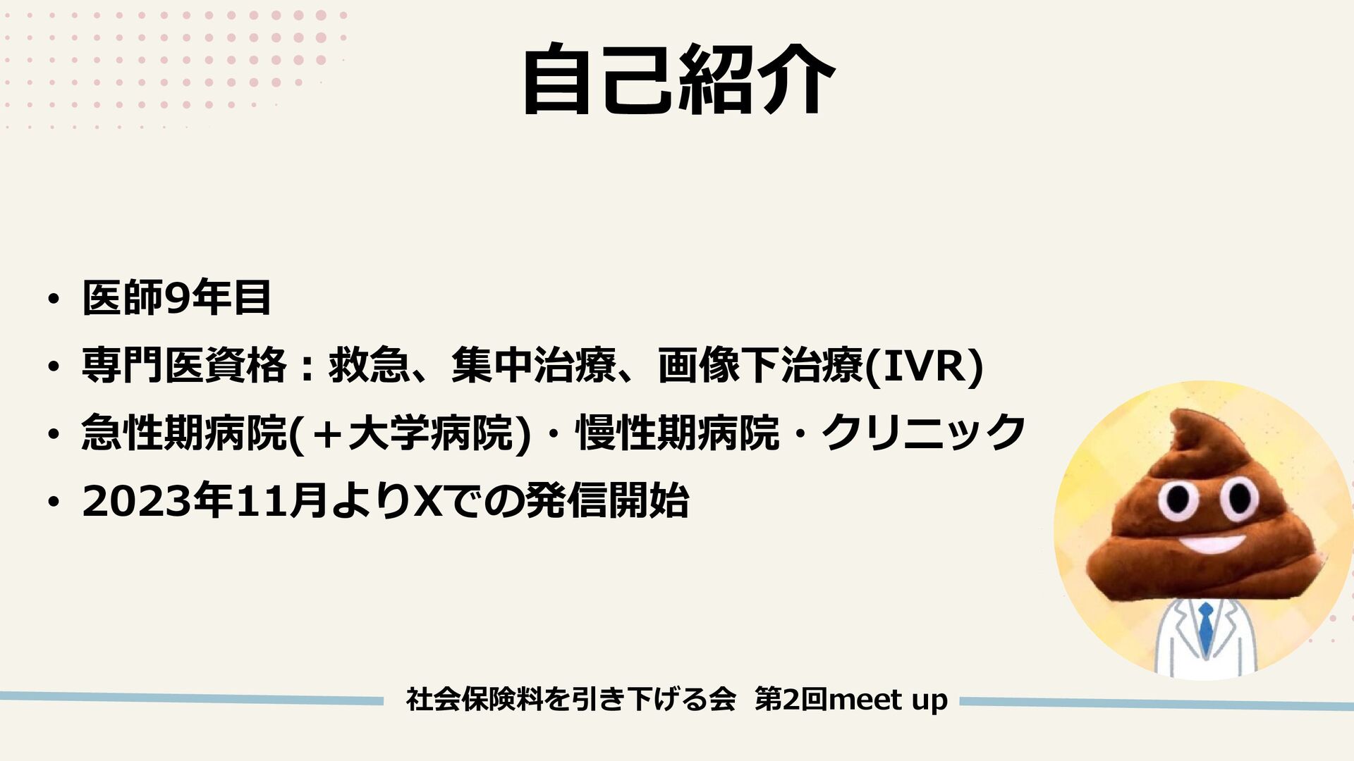 • 医師9年目 • 専門医資格:救急、集中治療、画像下治療(IVR) • 急性期病院(+大学病院)・慢性期病院・クリニック • 2023年11月よりXでの発信開始 自己紹介 社会保険料を引き下げる会