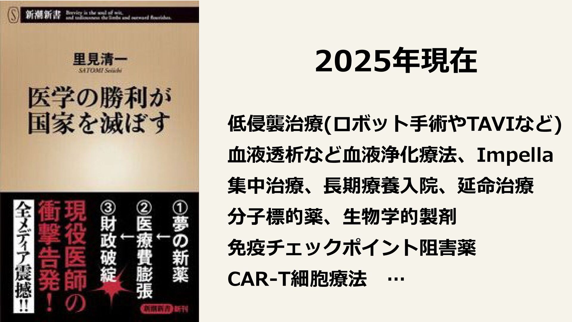 2025年現在 低侵襲治療(ロボット手術やTAVIなど) 血液透析など血液浄化療法、Impella 集中治療、長期療養入院、延命治療 分子標的薬、生物学的製剤 免疫チェックポイント阻害薬 CAR-T細胞療法 …