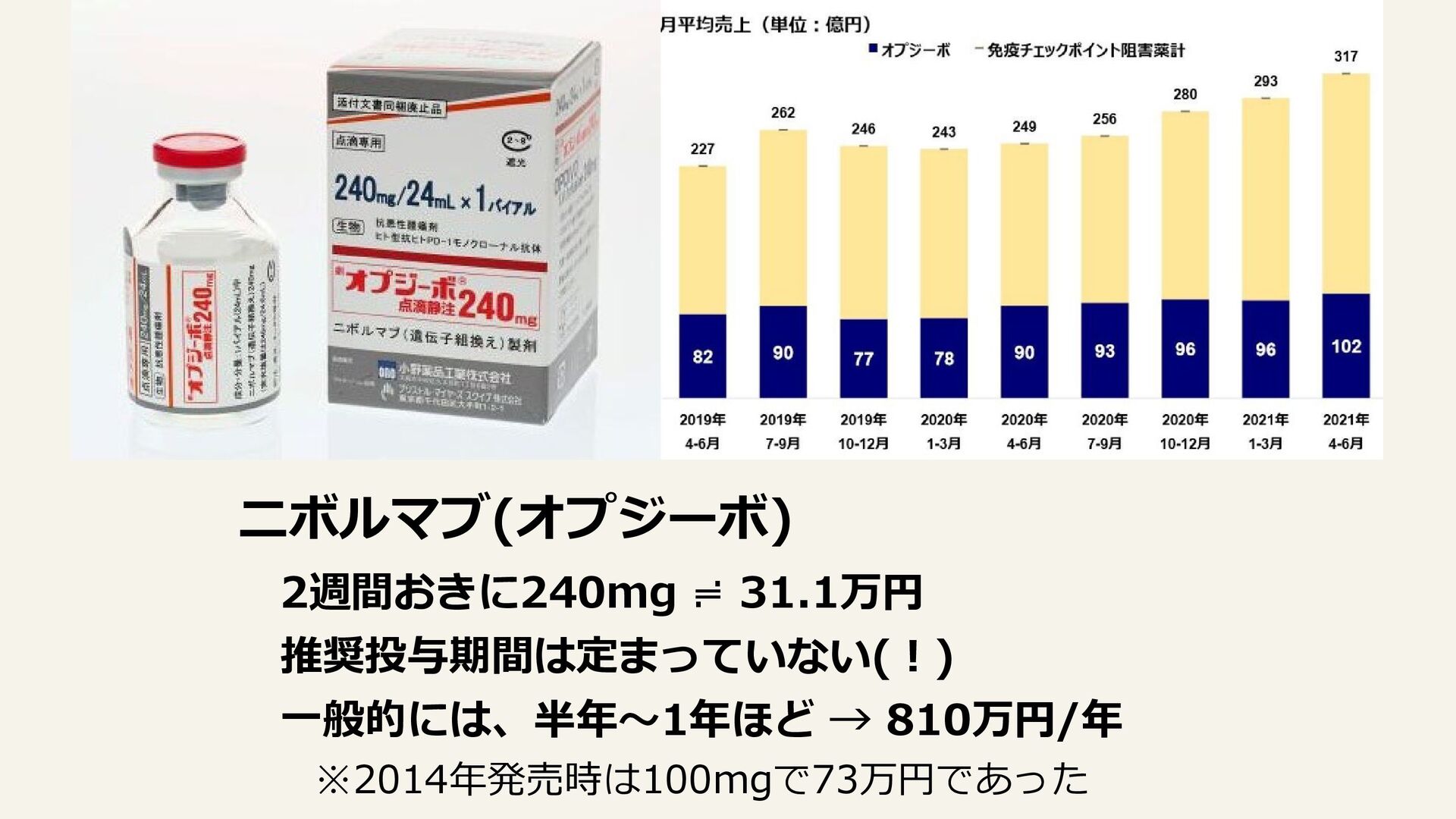 ニボルマブ(オプジーボ) 2週間おきに240mg ≓ 31.1万円 推奨投与期間は定まっていない(!) 一般的には、半年~1年ほど → 810万円/年 ※2014年発売時は100mgで73万円であった
