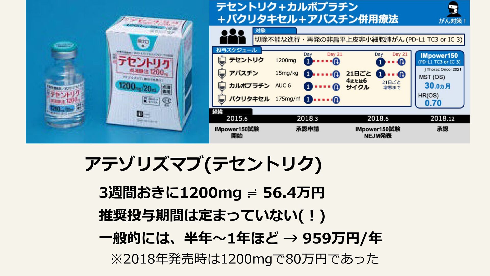 アテゾリズマブ(テセントリク) 3週間おきに1200mg ≓ 56.4万円 推奨投与期間は定まっていない(!) 一般的には、半年~1年ほど → 959万円/年 ※2018年発売時は1200mgで80万円であった