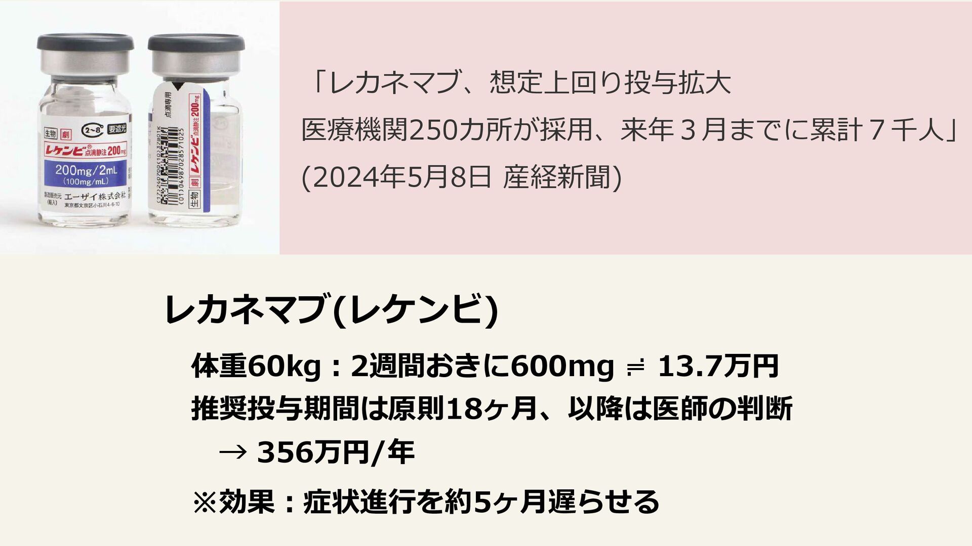 レカネマブ(レケンビ) 体重60kg:2週間おきに600mg ≓ 13.7万円 推奨投与期間は原則18ヶ月、以降は医師の判断 → 356万円/年 ※効果:症状進行を約5ヶ月遅らせる 「レカネマブ、想定上回り投与拡大 医療機関250カ所が採用、来年3月までに累計7千人」