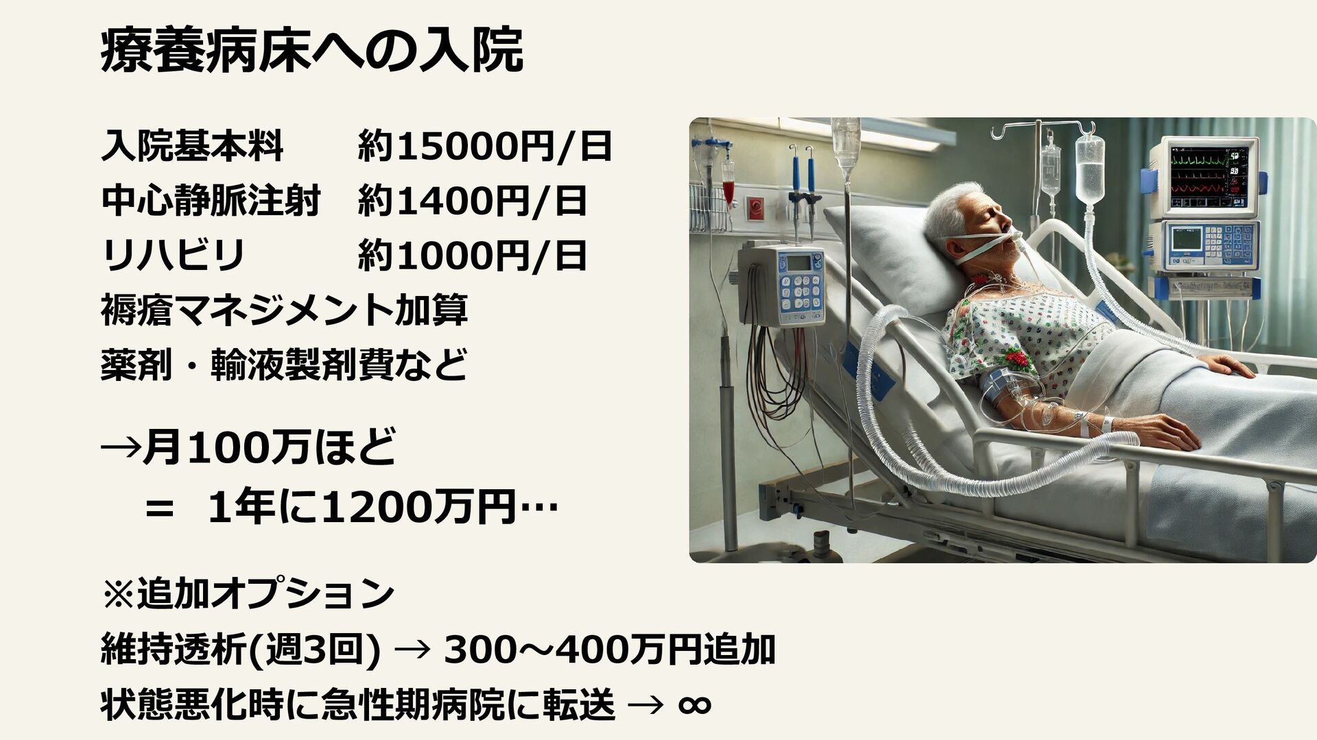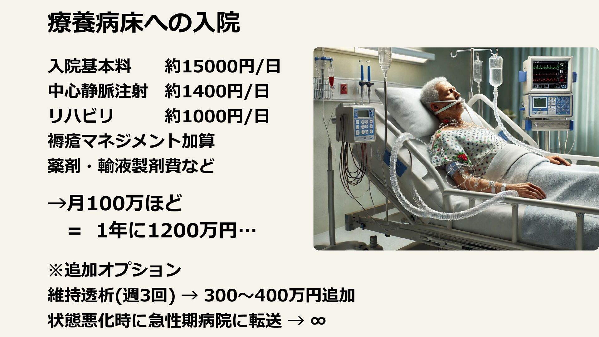 = 1年に1200万円… ※追加オプション 維持透析(週3回) → 300~400万円追加 状態悪化時に急性期病院に転送 → ∞