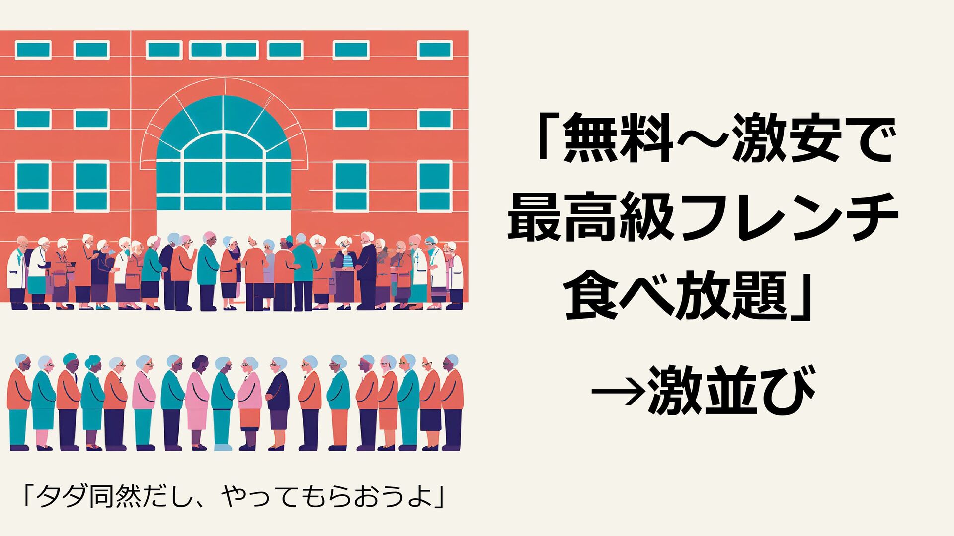 「無料~激安で 最高級フレンチ 食べ放題」 →激並び 「タダ同然だし、やってもらおうよ」