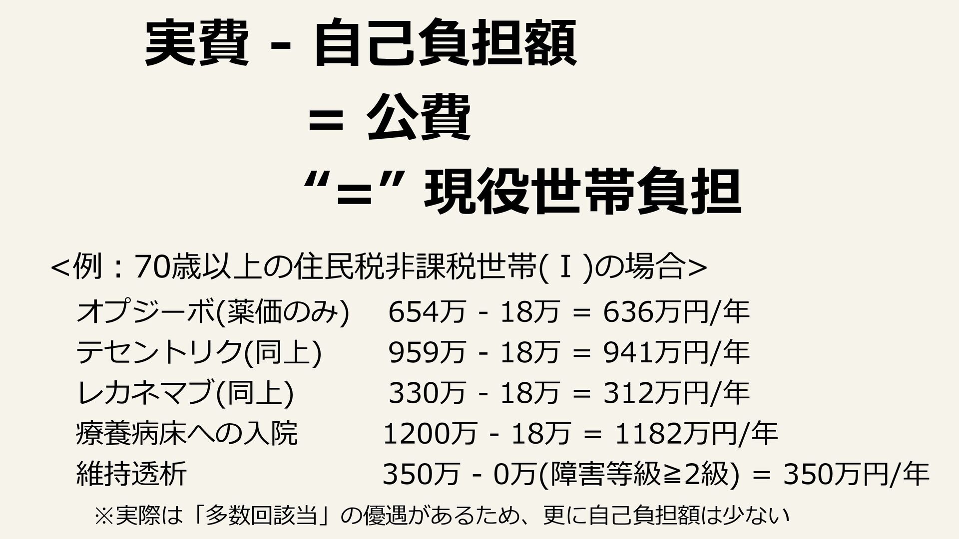 - 18万 = 636万円/年 テセントリク(同上) 959万 - 18万 = 941万円/年 レカネマブ(同上) 330万 - 18万 = 312万円/年 療養病床への入院 1200万 - 18万 = 1182万円/年 維持透析 350万 - 0万(障害等級≧2級) = 350万円/年 ※実際は「多数回該当」の優遇があるため、更に自己負担額は少ない