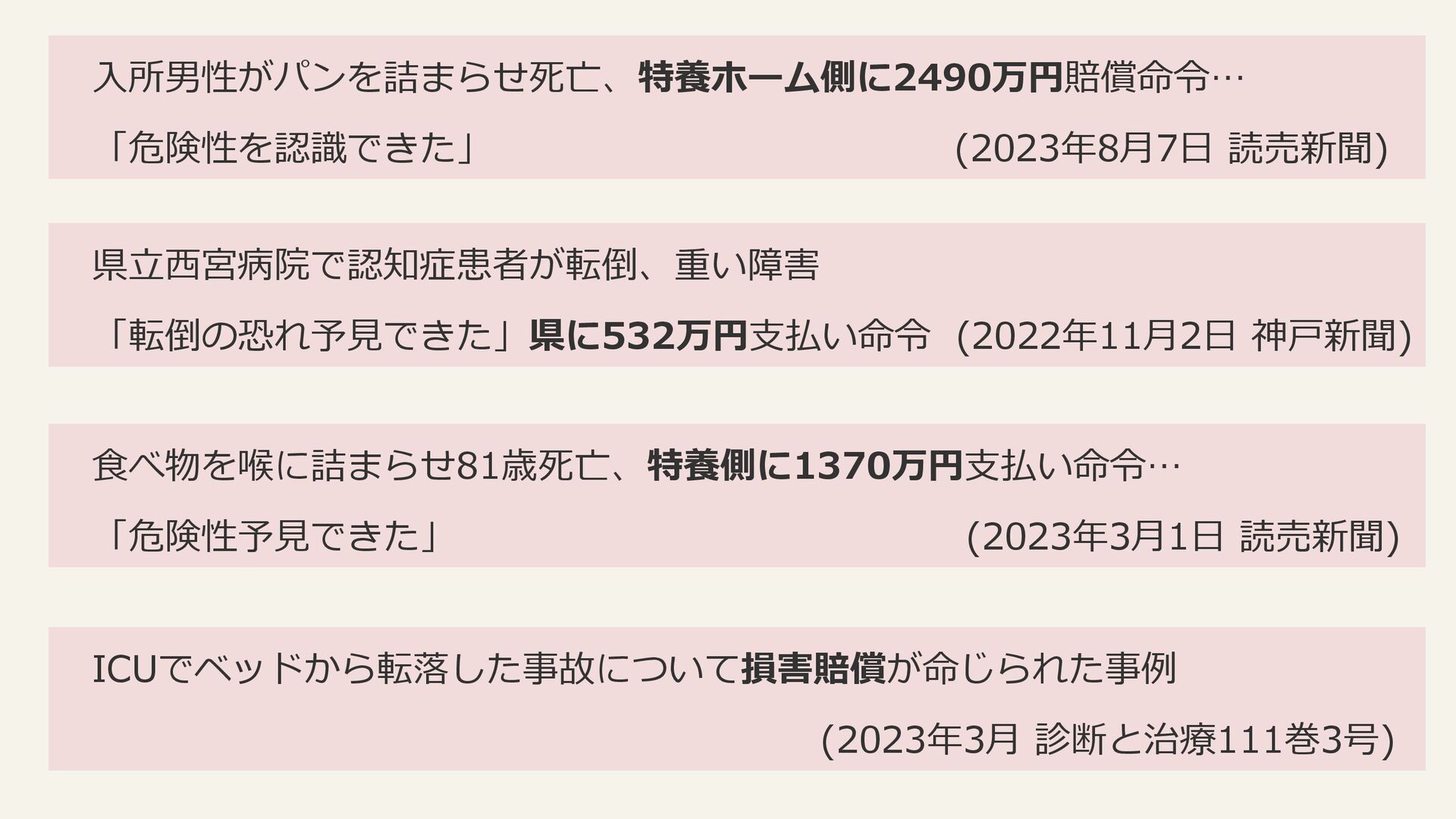 入所男性がパンを詰まらせ死亡、特養ホーム側に2490万円賠償命令… 「危険性を認識できた」 (2023年8月7日 読売新聞) 県立西宮病院で認知症患者が転倒、重い障害 「転倒の恐れ予見できた」県に532万円支払い命令 (2022年11月2日 神戸新聞) ICUでベッドから転落した事故について損害賠償が命じられた事例 (2023年3月