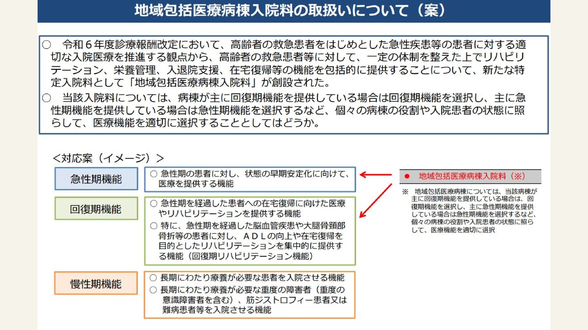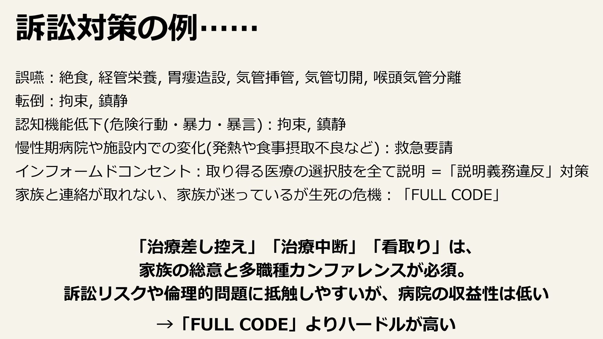 鎮静 慢性期病院や施設内での変化(発熱や食事摂取不良など):救急要請 インフォームドコンセント:取り得る医療の選択肢を全て説明 =「説明義務違反」対策 家族と連絡が取れない、家族が迷っているが生死の危機:「FULL CODE」 「治療差し控え」「治療中断」「看取り」は、 家族の総意と多職種カンファレンスが必須。 訴訟リスクや倫理的問題に抵触しやすいが、病院の収益性は低い →「FULL CODE」よりハードルが高い