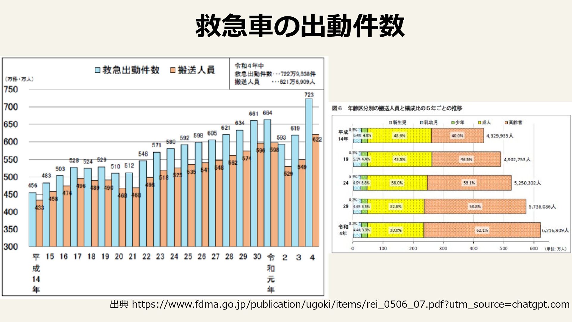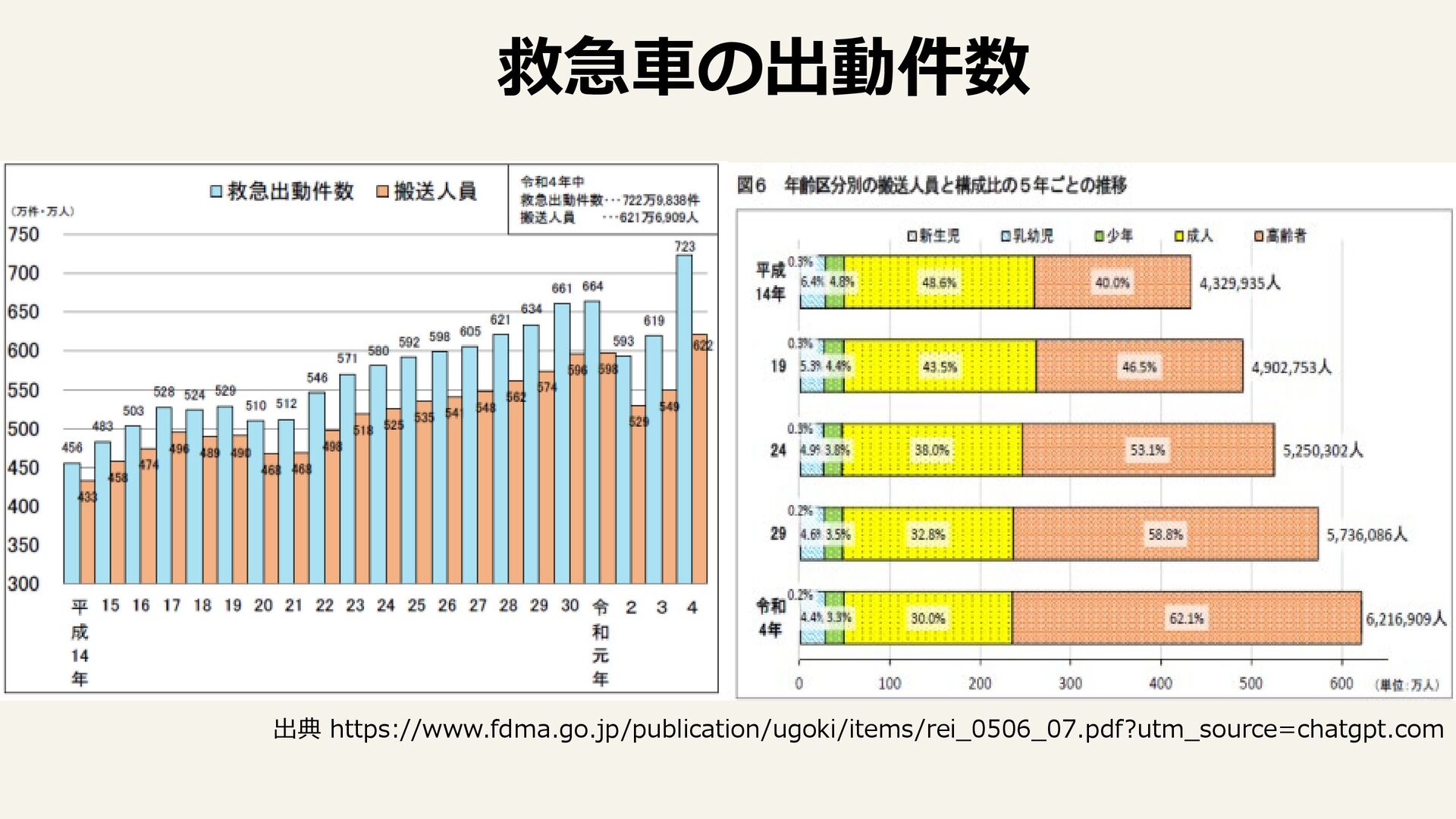 救急車の出動件数 出典 https://www.fdma.go.jp/publication/ugoki/items/rei_0506_07.pdf?utm_source=chatgpt.com