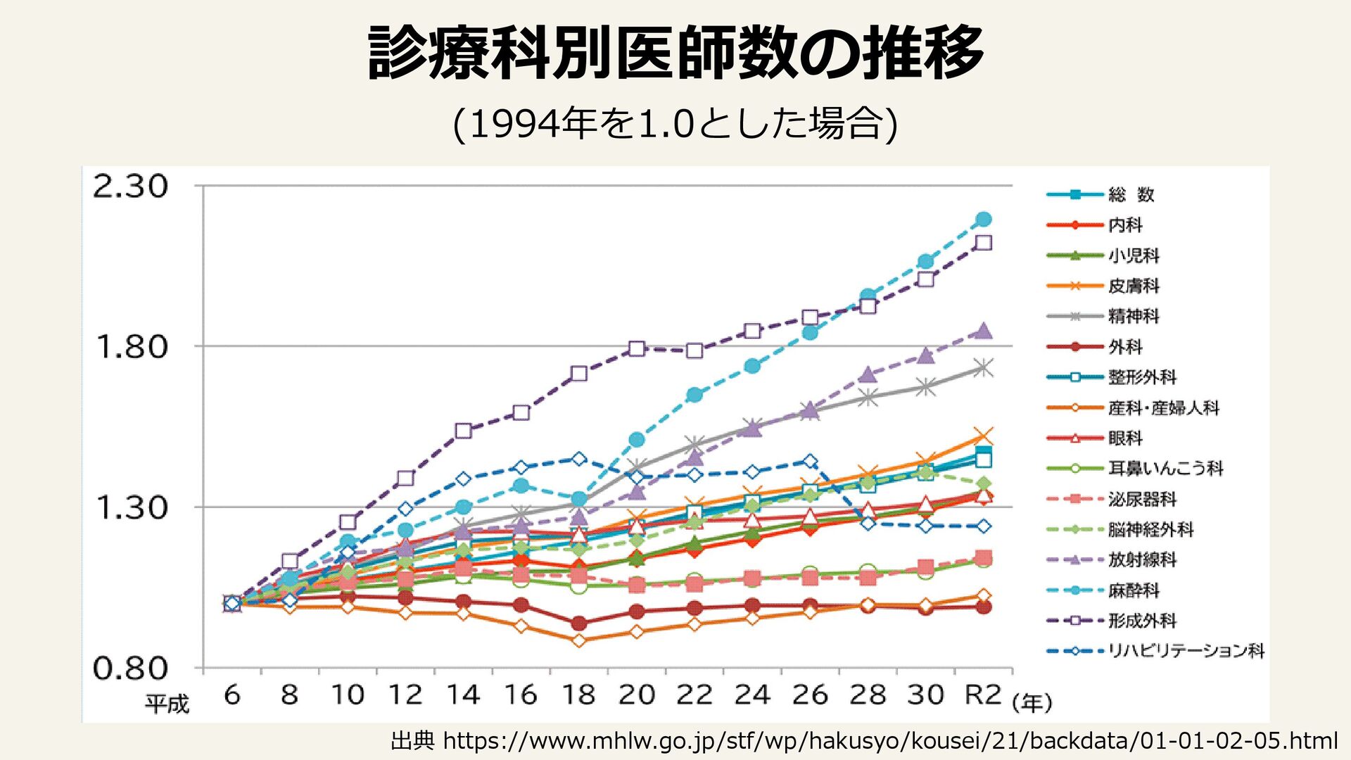 診療科別医師数の推移 (1994年を1.0とした場合) 出典 https://www.mhlw.go.jp/stf/wp/hakusyo/kousei/21/backdata/01-01-02-05.html