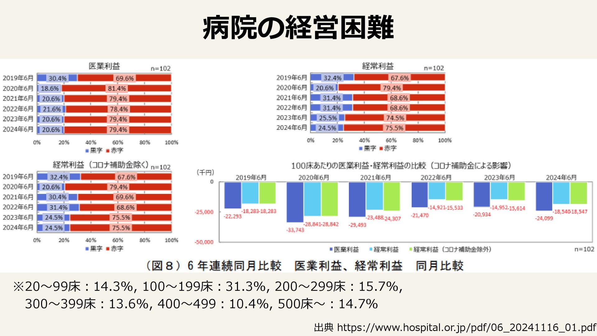 病院の経営困難 ※20~99床:14.3%, 100~199床:31.3%, 200~299床:15.7%, 300~399床:13.6%, 400~499:10.4%, 500床~:14.7% 出典 https://www.hospital.or.jp/pdf/06_20241116_01.pdf