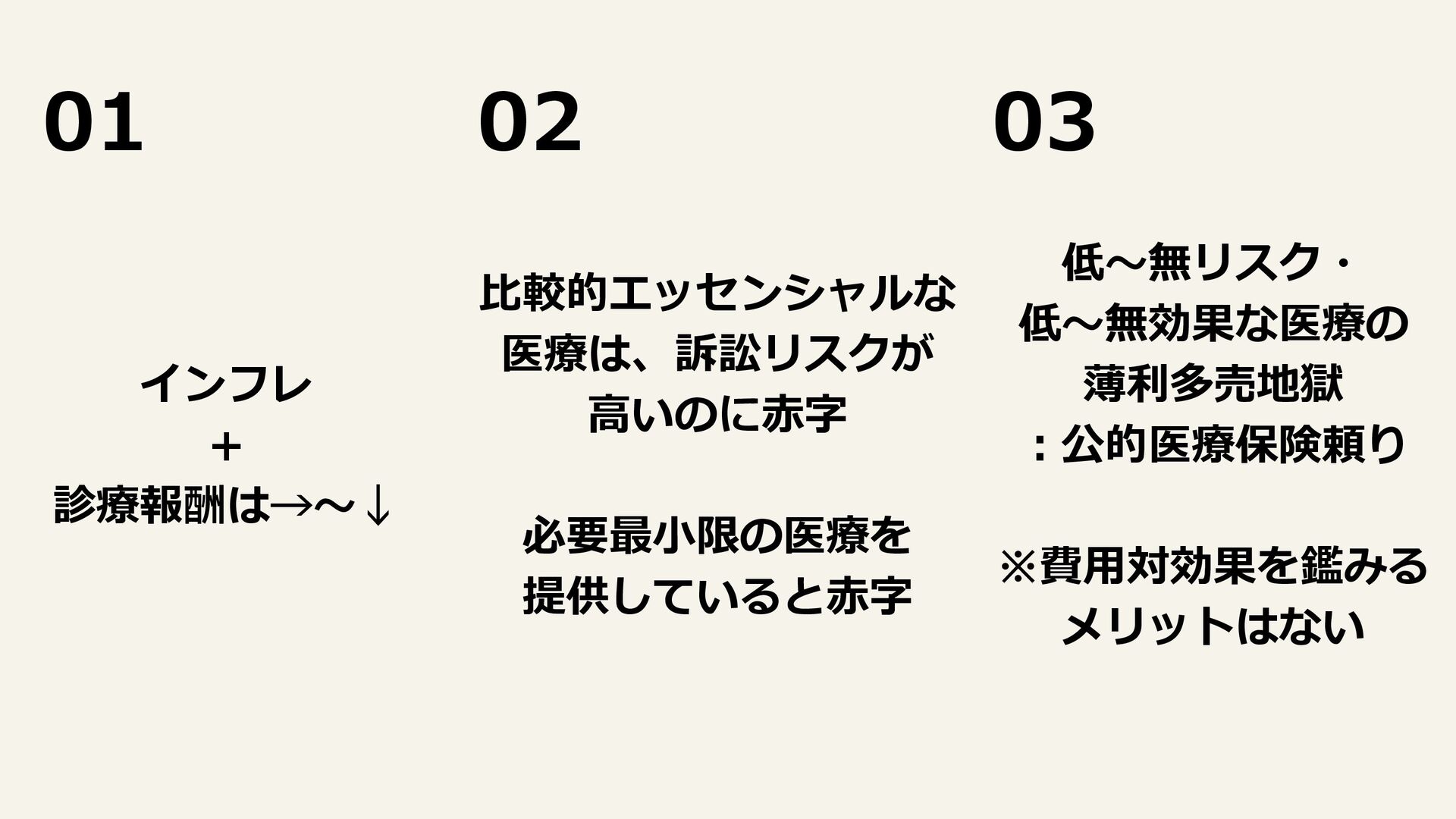 01 インフレ + 診療報酬は→~↓ 02 比較的エッセンシャルな 医療は、訴訟リスクが 高いのに赤字 必要最小限の医療を 提供していると赤字