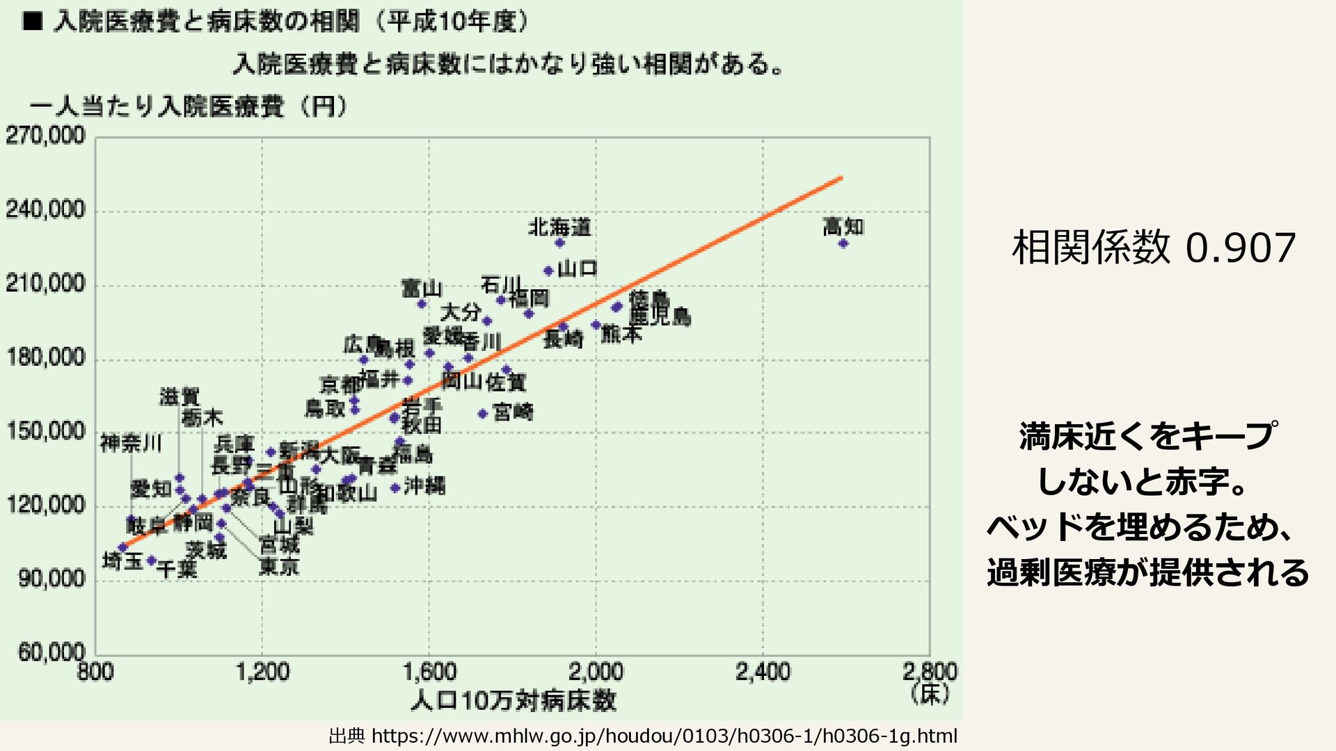 相関係数 0.907 満床近くをキープ しないと赤字。 ベッドを埋めるため、 過剰医療が提供される 出典 https://www.mhlw.go.jp/houdou/0103/h0306-1/h0306-1g.html