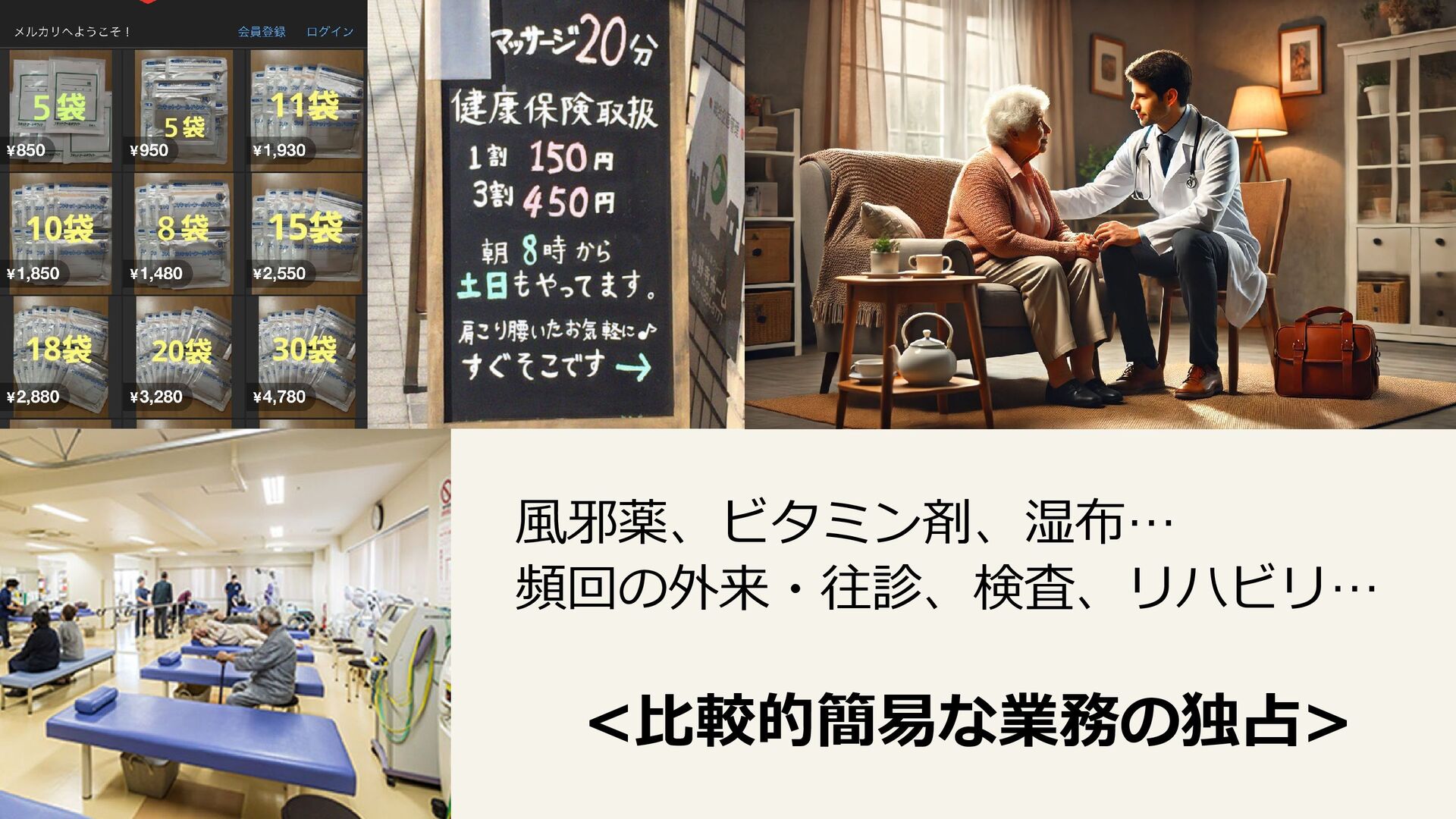 風邪薬、ビタミン剤、湿布… 頻回の外来・往診、検査、リハビリ… <比較的簡易な業務の独占>