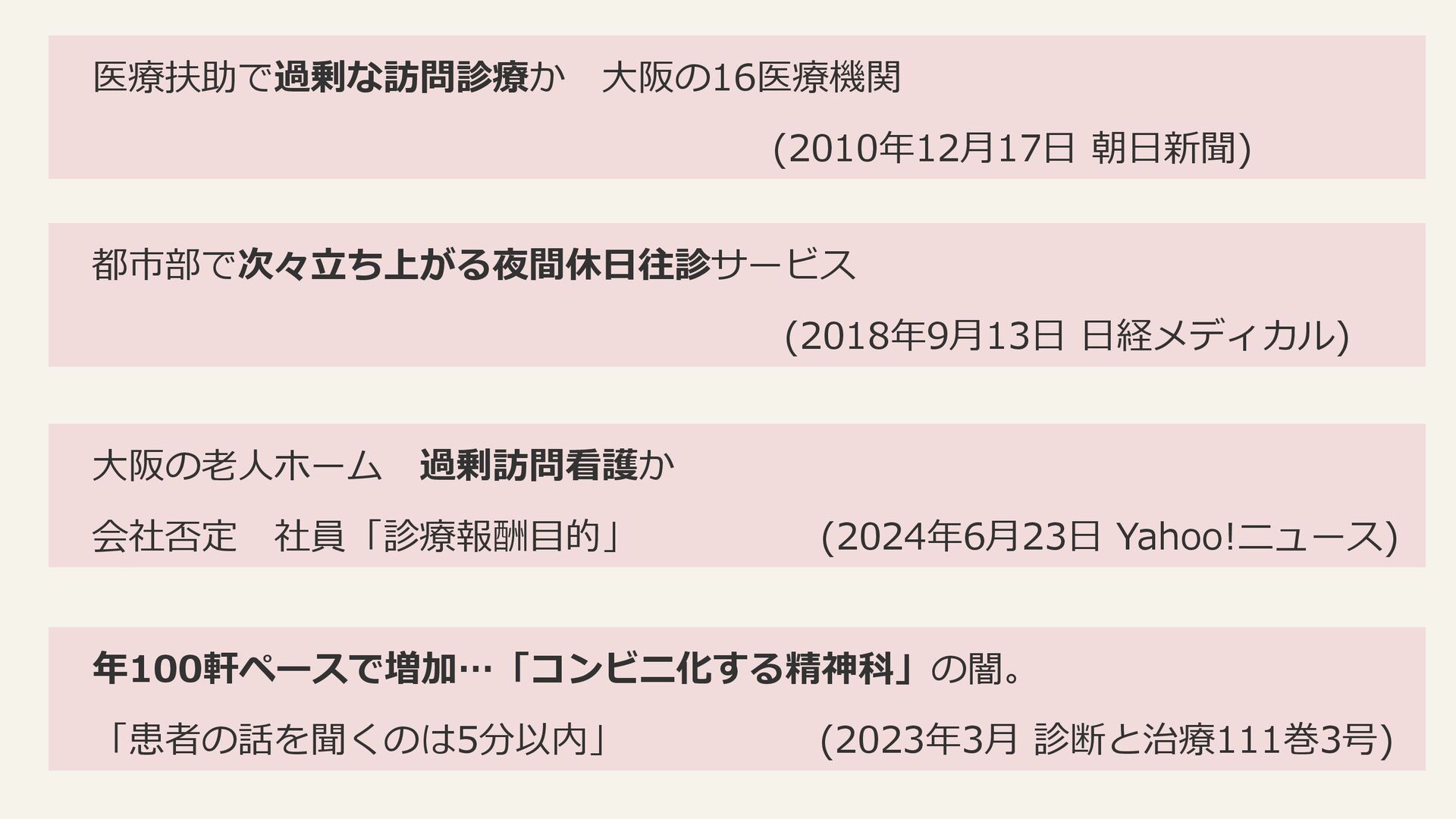 医療扶助で過剰な訪問診療か 大阪の16医療機関 (2010年12月17日 朝日新聞) 都市部で次々立ち上がる夜間休日往診サービス (2018年9月13日 日経メディカル) 年100軒ペースで増加…「コンビニ化する精神科」の闇。 「患者の話を聞くのは5分以内」 (2023年3月