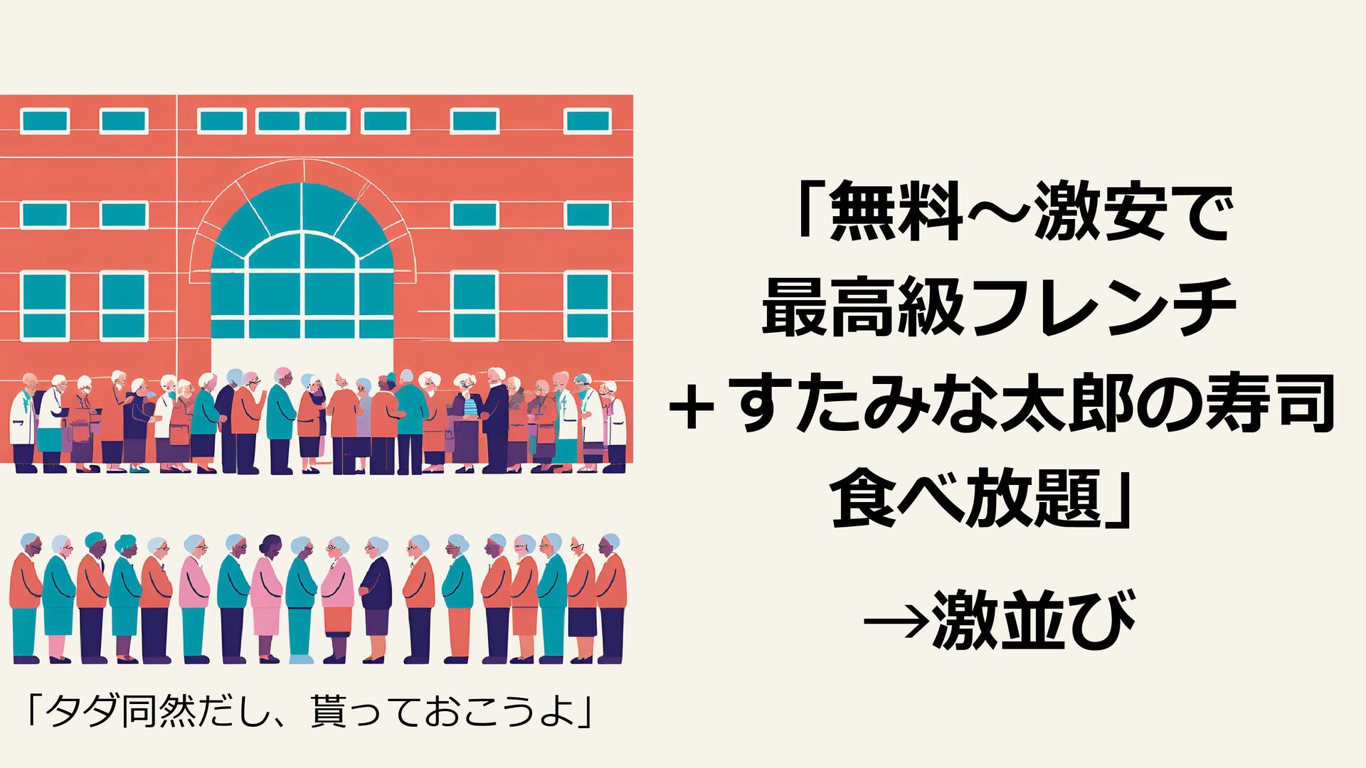 「無料~激安で 最高級フレンチ +すたみな太郎の寿司 食べ放題」 →激並び 「タダ同然だし、貰っておこうよ」