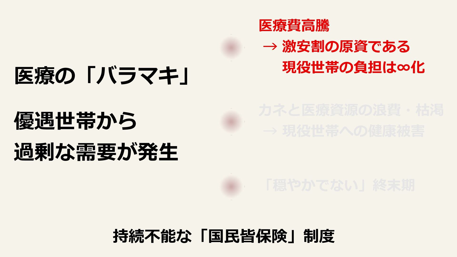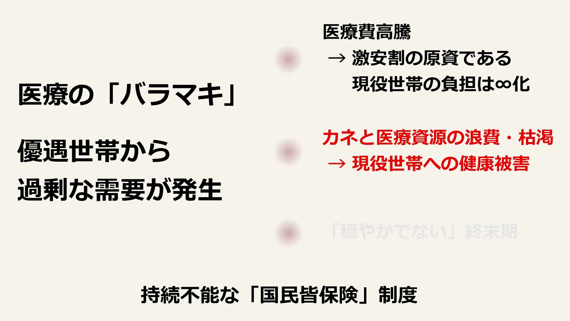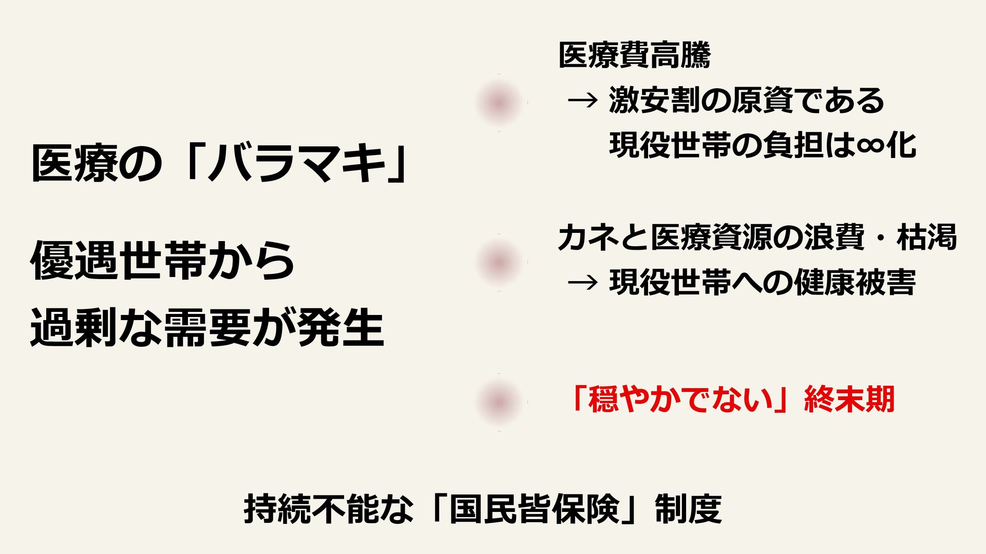 医療の「バラマキ」 優遇世帯から 過剰な需要が発生 持続不能な「国民皆保険」制度 医療費高騰 → 激安割の原資である 現役世帯の負担は∞化 「穏やかでない」終末期 カネと医療資源の浪費・枯渇