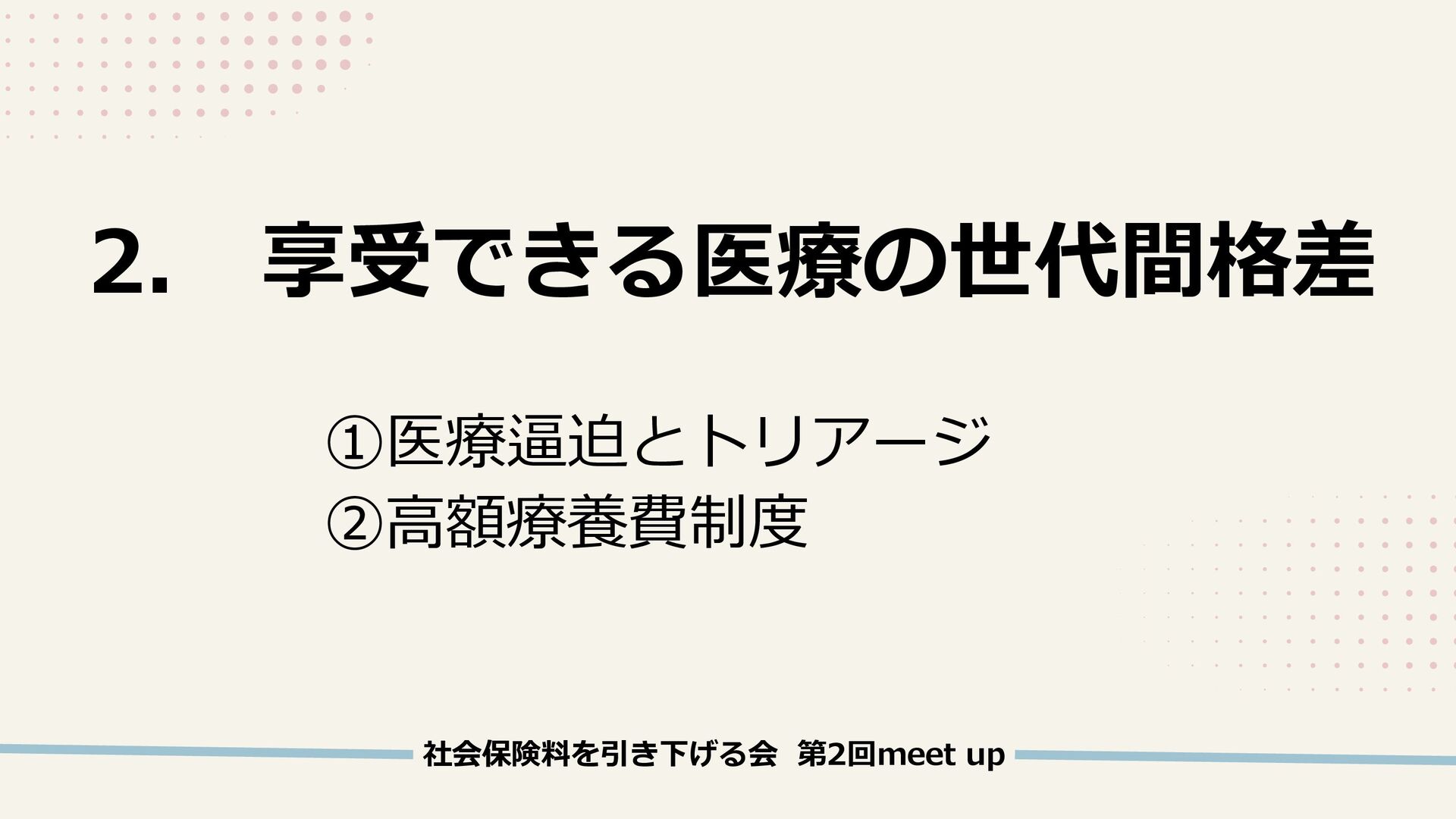 2. 享受できる医療の世代間格差 ①医療逼迫とトリアージ ②高額療養費制度 社会保険料を引き下げる会 第2回meet up