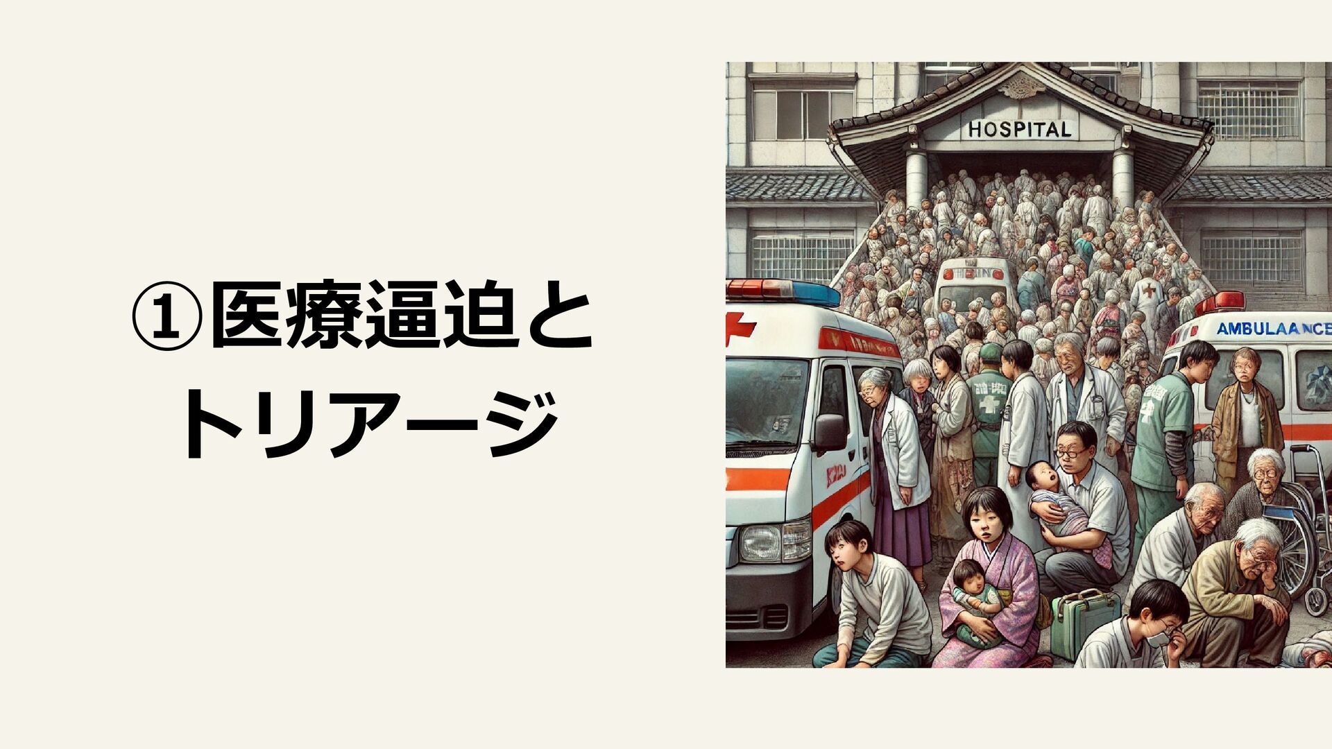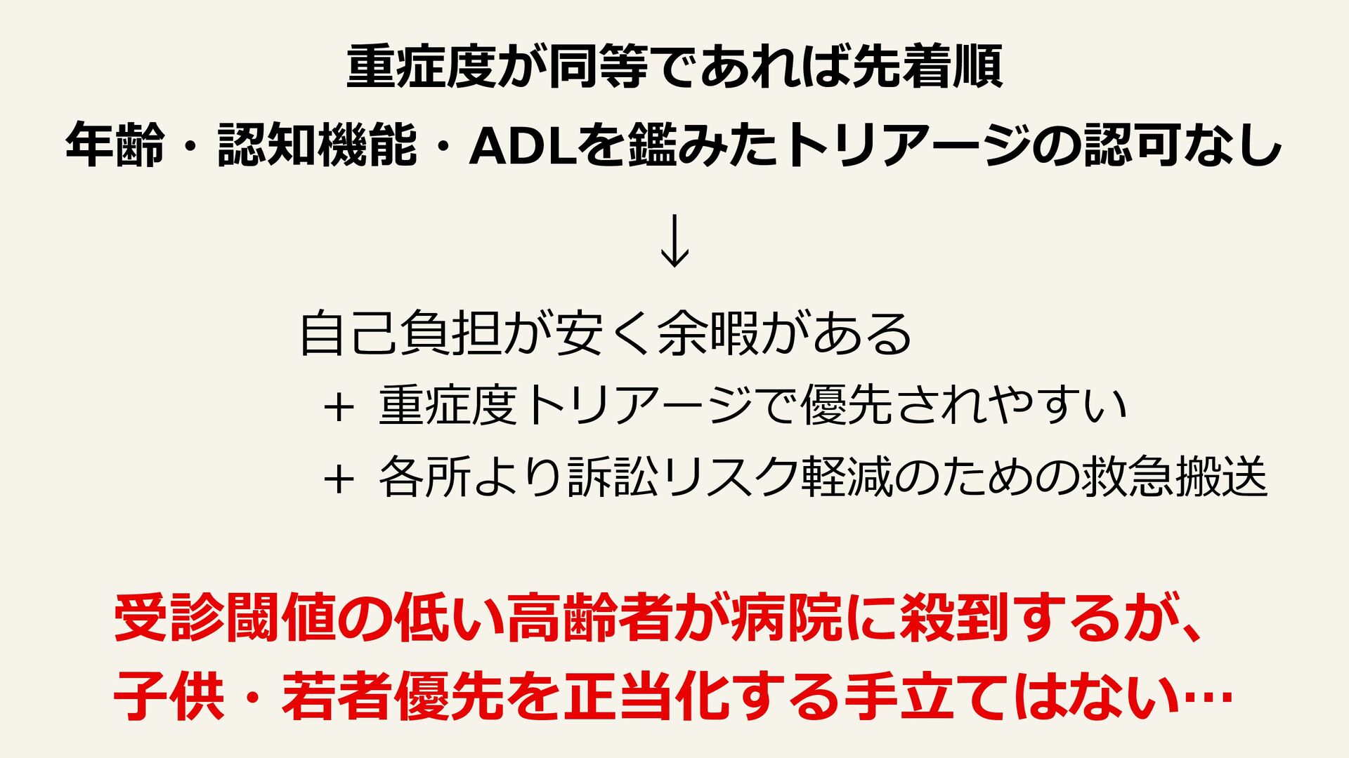 重症度が同等であれば先着順 年齢・認知機能・ADLを鑑みたトリアージの認可なし ↓ 自己負担が安く余暇がある + 重症度トリアージで優先されやすい + 各所より訴訟リスク軽減のための救急搬送 受診閾値の低い高齢者が病院に殺到するが、 子供・若者優先を正当化する手立てはない…