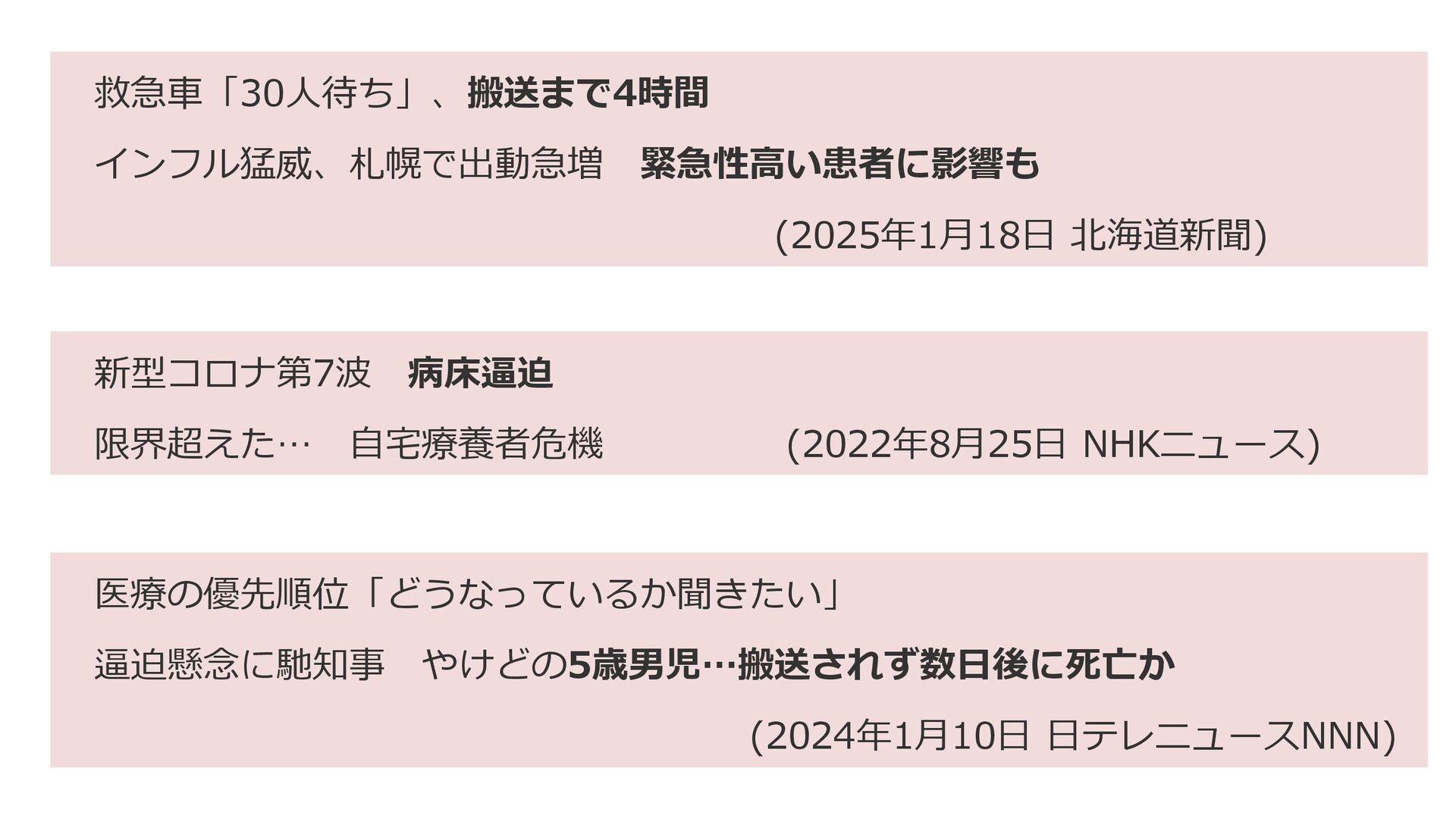 救急車「30人待ち」、搬送まで4時間 インフル猛威、札幌で出動急増 緊急性高い患者に影響も (2025年1月18日 北海道新聞) 医療の優先順位「どうなっているか聞きたい」 逼迫懸念に馳知事 やけどの5歳男児…搬送されず数日後に死亡か (2024年1月10日 日テレニュースNNN)