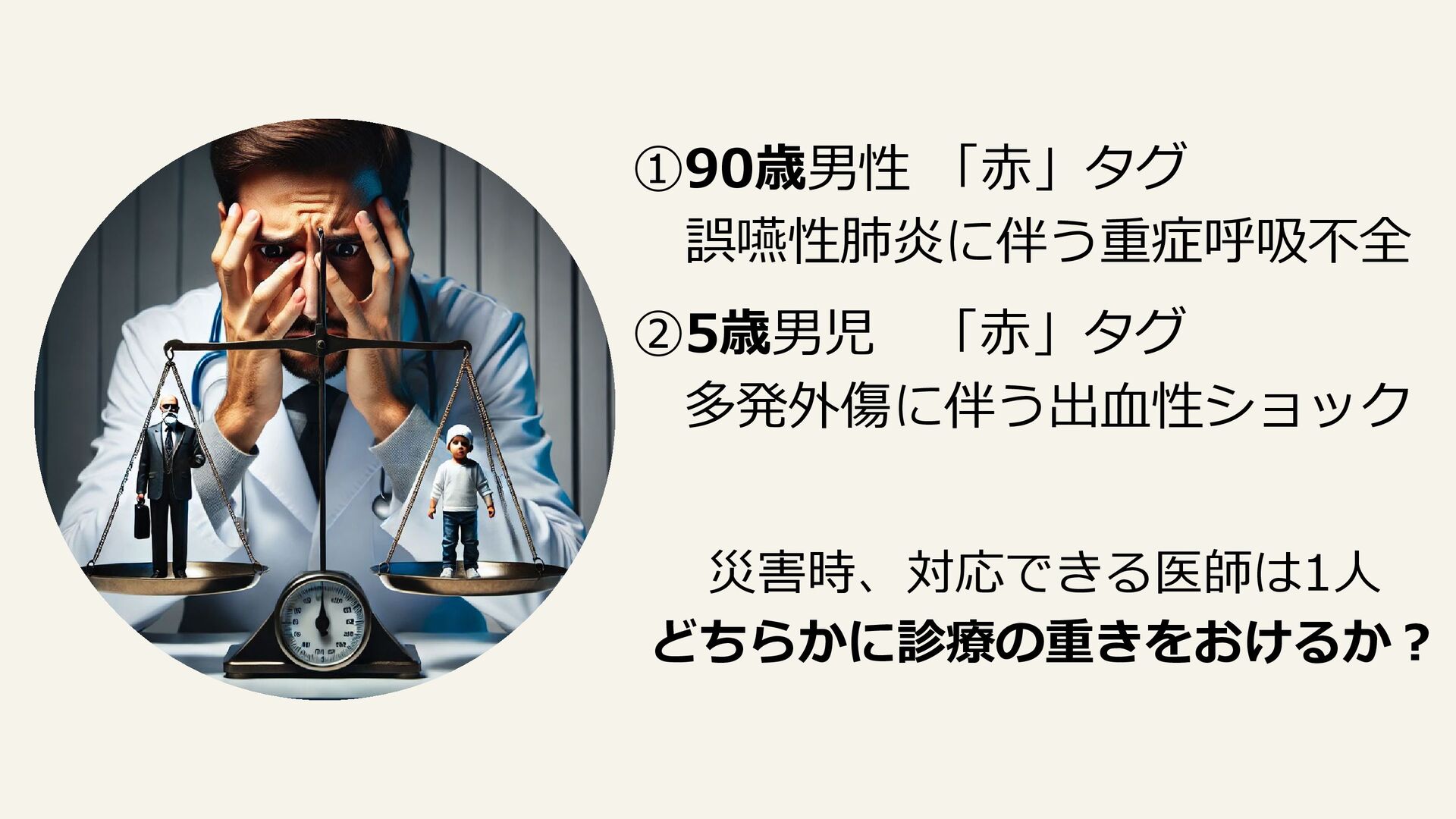 ①90歳男性 「赤」タグ 誤嚥性肺炎に伴う重症呼吸不全 ②5歳男児 「赤」タグ 多発外傷に伴う出血性ショック 災害時、対応できる医師は1人 どちらかに診療の重きをおけるか?