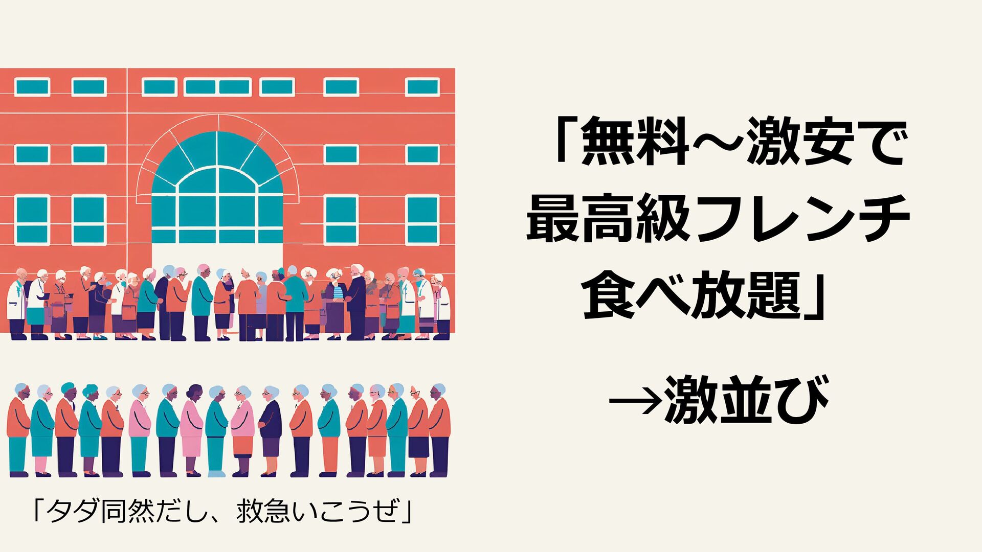 「無料~激安で 最高級フレンチ 食べ放題」 →激並び 「タダ同然だし、救急いこうぜ」