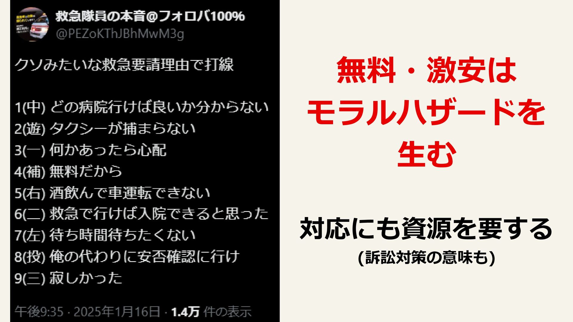 無料・激安は モラルハザードを 生む 対応にも資源を要する (訴訟対策の意味も)