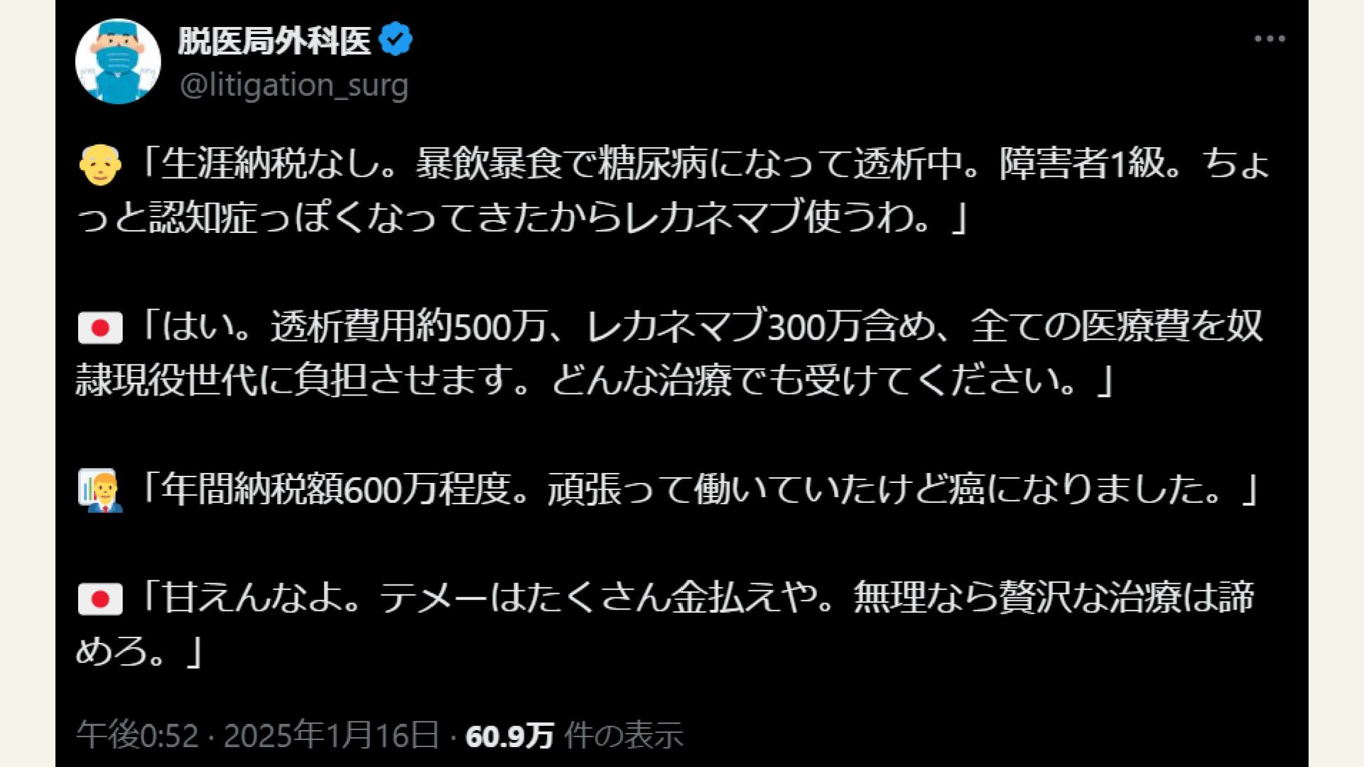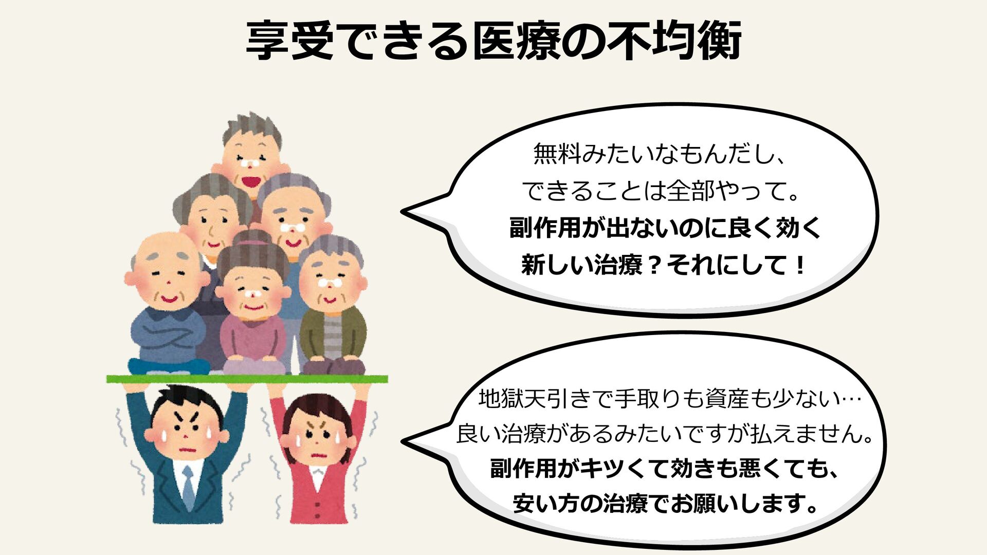 無料みたいなもんだし、 できることは全部やって。 副作用が出ないのに良く効く 新しい治療?それにして! 地獄天引きで手取りも資産も少ない… 良い治療があるみたいですが払えません。 副作用がキツくて効きも悪くても、 安い方の治療でお願いします。 享受できる医療の不均衡