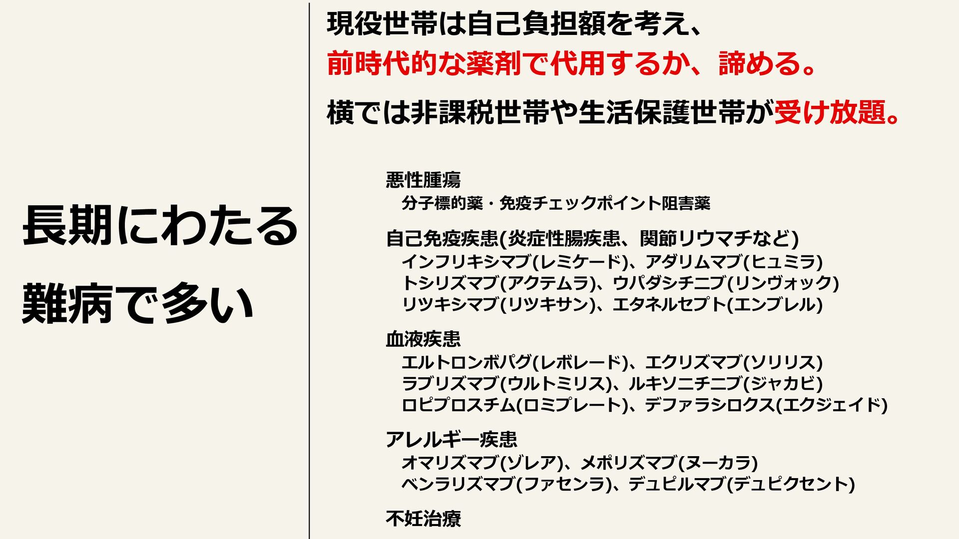 アレルギー疾患 オマリズマブ(ゾレア)、メポリズマブ(ヌーカラ) ベンラリズマブ(ファセンラ)、デュピルマブ(デュピクセント) 不妊治療 現役世帯は自己負担額を考え、 前時代的な薬剤で代用するか、諦める。 横では非課税世帯や生活保護世帯が受け放題。 長期にわたる 難病で多い