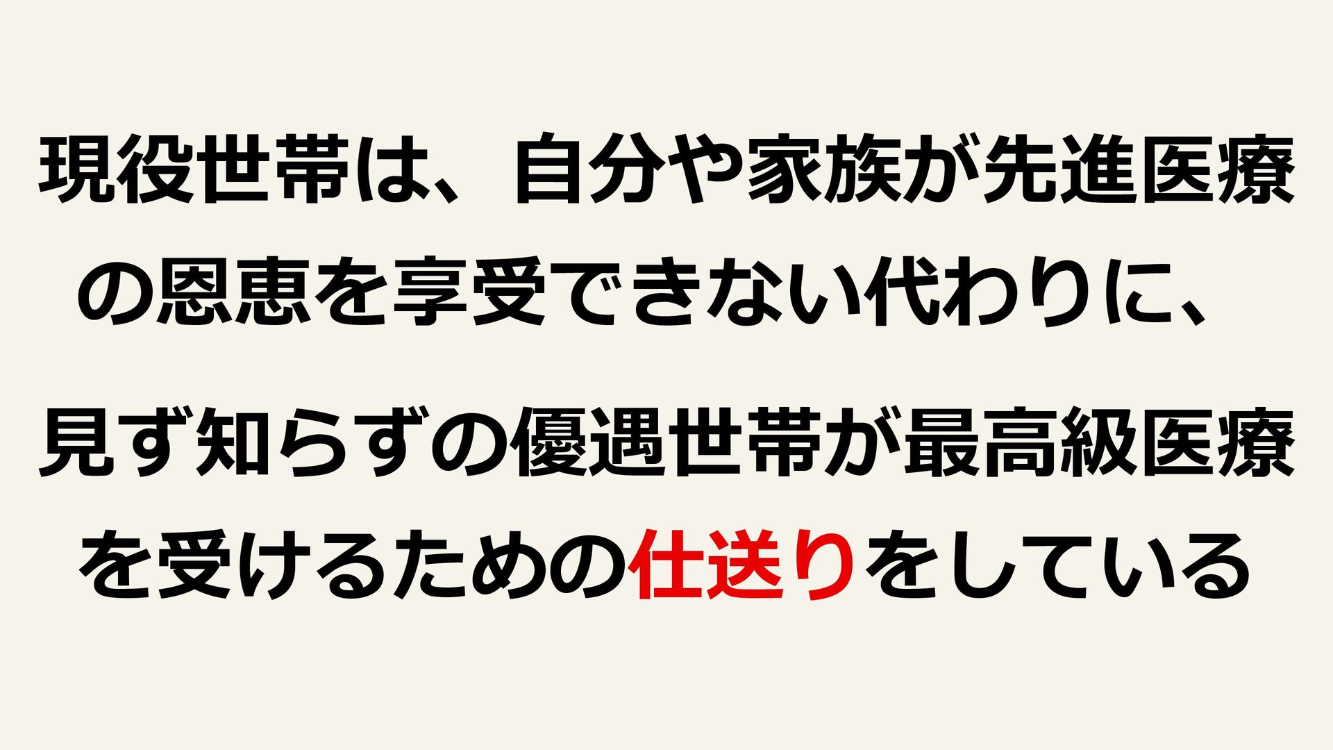 現役世帯は、自分や家族が先進医療 の恩恵を享受できない代わりに、 見ず知らずの優遇世帯が最高級医療 を受けるための仕送りをしている