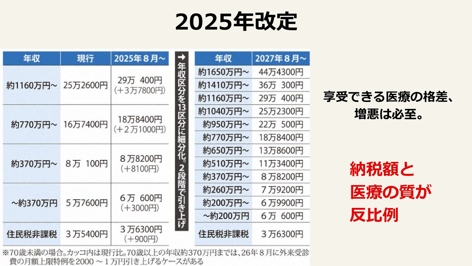 2025年改定 享受できる医療の格差、 増悪は必至。 納税額と 医療の質が 反比例