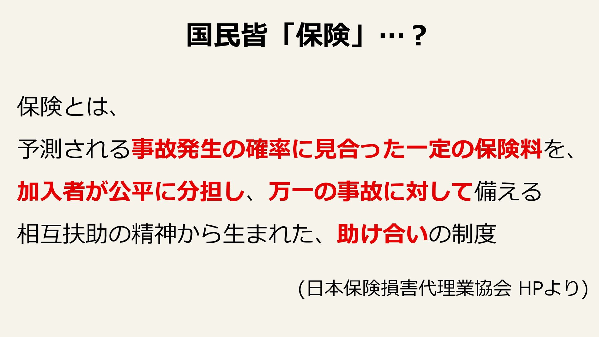 国民皆「保険」…? 保険とは、 予測される事故発生の確率に見合った一定の保険料を、 加入者が公平に分担し、万一の事故に対して備える 相互扶助の精神から生まれた、助け合いの制度 (日本保険損害代理業協会 HPより)
