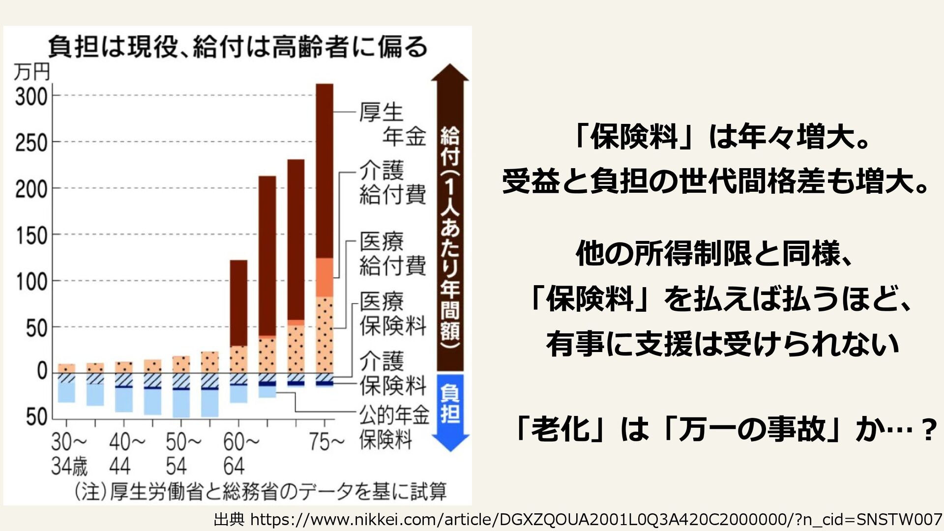 「保険料」は年々増大。 受益と負担の世代間格差も増大。 他の所得制限と同様、 「保険料」を払えば払うほど、 有事に支援は受けられない 「老化」は「万一の事故」か…? 出典 https://www.nikkei.com/article/DGXZQOUA2001L0Q3A420C2000000/?n_cid=SNSTW007