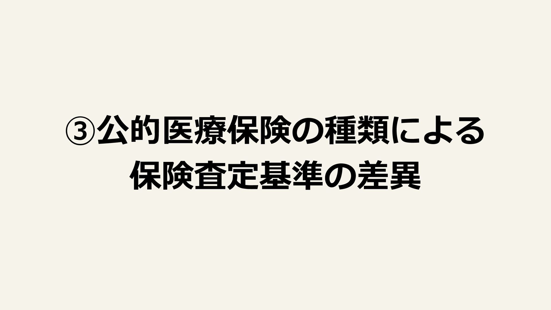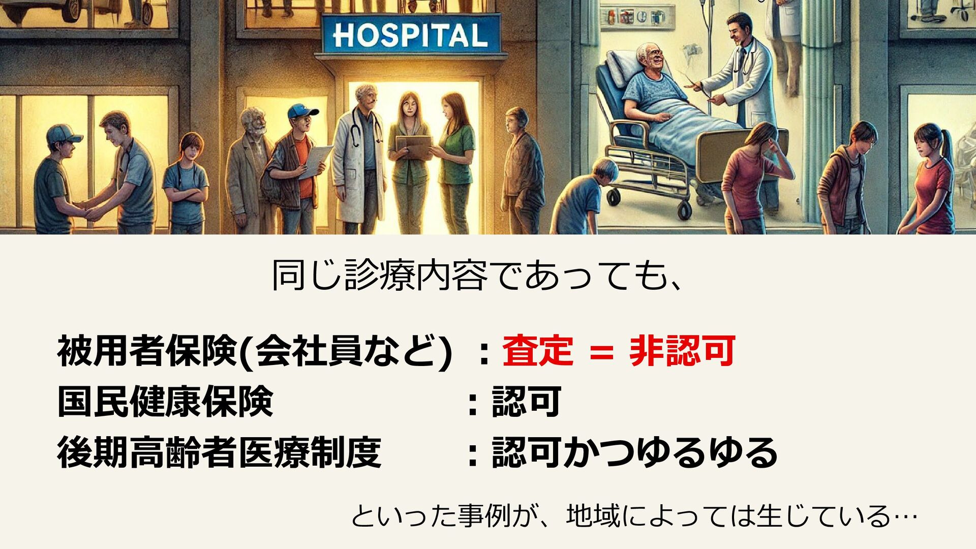 同じ診療内容であっても、 被用者保険(会社員など) :査定 = 非認可 国民健康保険 :認可 後期高齢者医療制度 :認可かつゆるゆる といった事例が、地域によっては生じている…