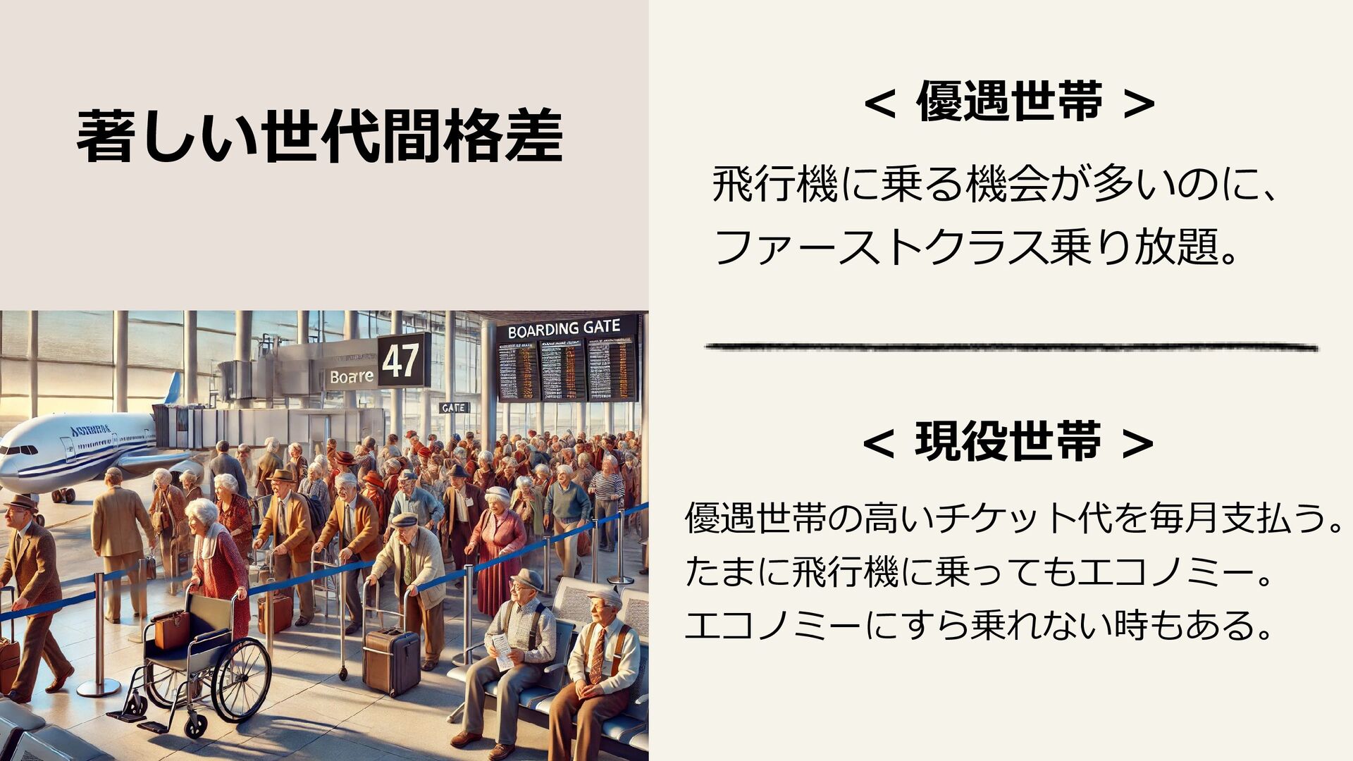 著しい世代間格差 < 現役世帯 > 優遇世帯の高いチケット代を毎月支払う。 たまに飛行機に乗ってもエコノミー。 エコノミーにすら乗れない時もある。 < 優遇世帯 >