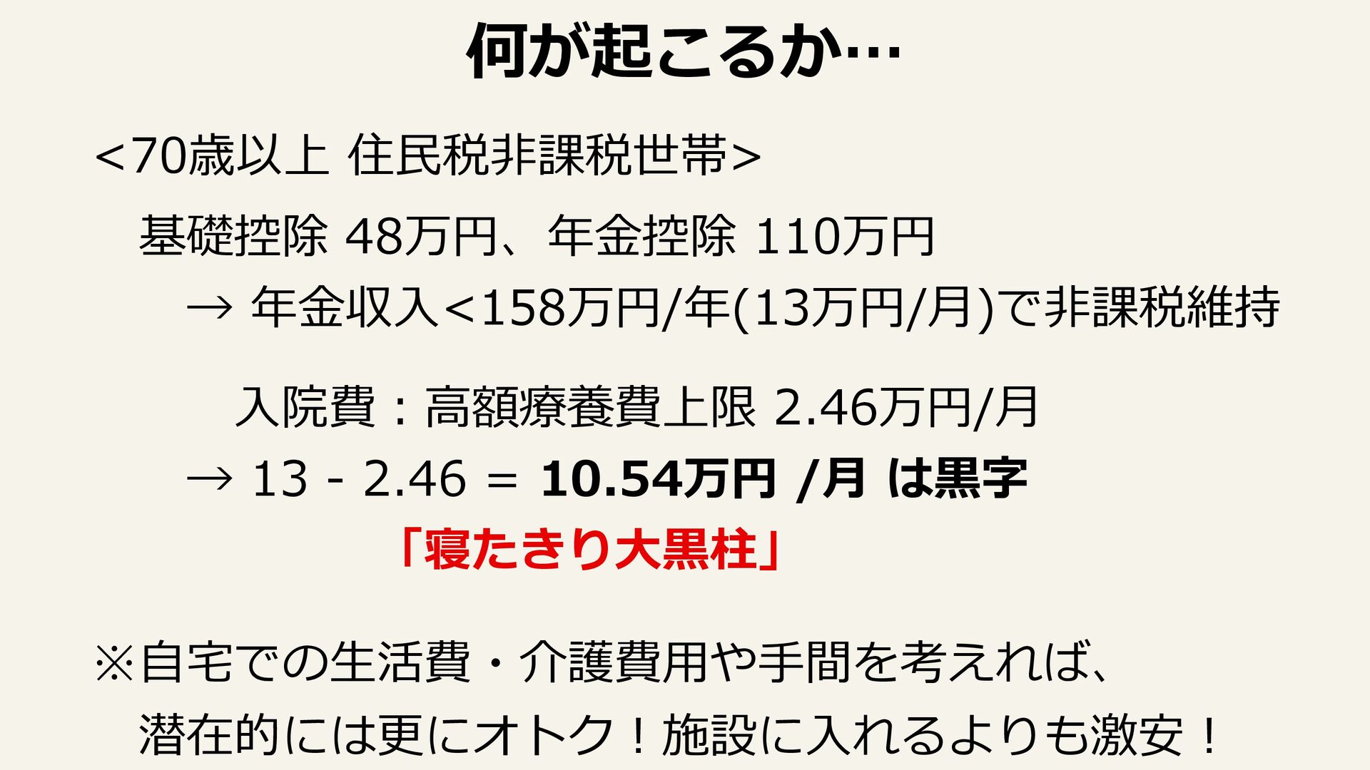 13 - 2.46 = 10.54万円 /月 は黒字 「寝たきり大黒柱」 ※自宅での生活費・介護費用や手間を考えれば、 潜在的には更にオトク!施設に入れるよりも激安! 何が起こるか…