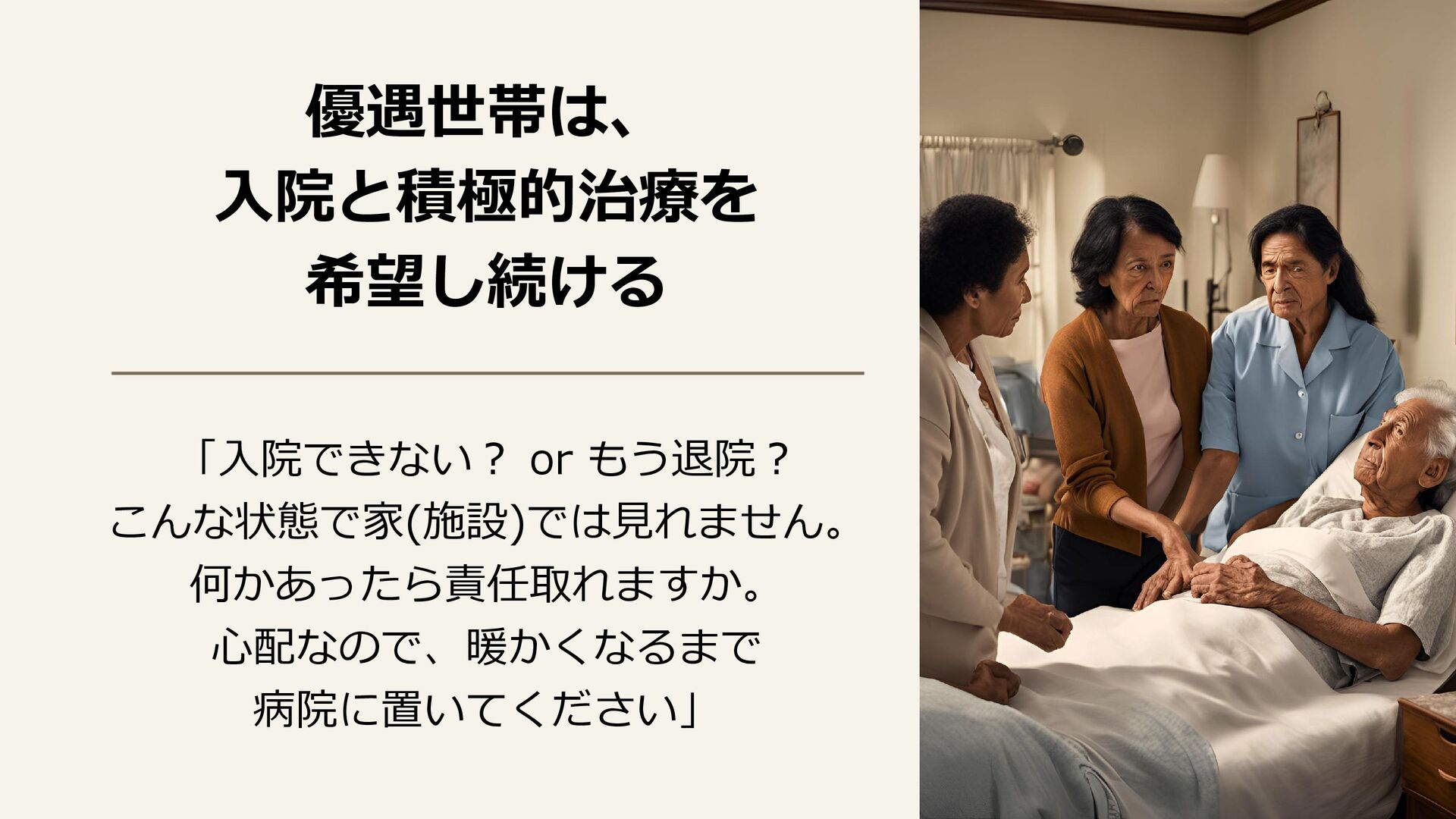 優遇世帯は、 入院と積極的治療を 希望し続ける 「入院できない? or もう退院? こんな状態で家(施設)では見れません。 何かあったら責任取れますか。 心配なので、暖かくなるまで 病院に置いてください」