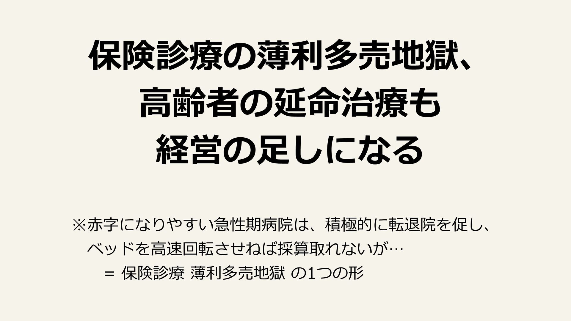 保険診療の薄利多売地獄、 高齢者の延命治療も 経営の足しになる ※赤字になりやすい急性期病院は、積極的に転退院を促し、 ベッドを高速回転させねば採算取れないが… = 保険診療 薄利多売地獄 の1つの形
