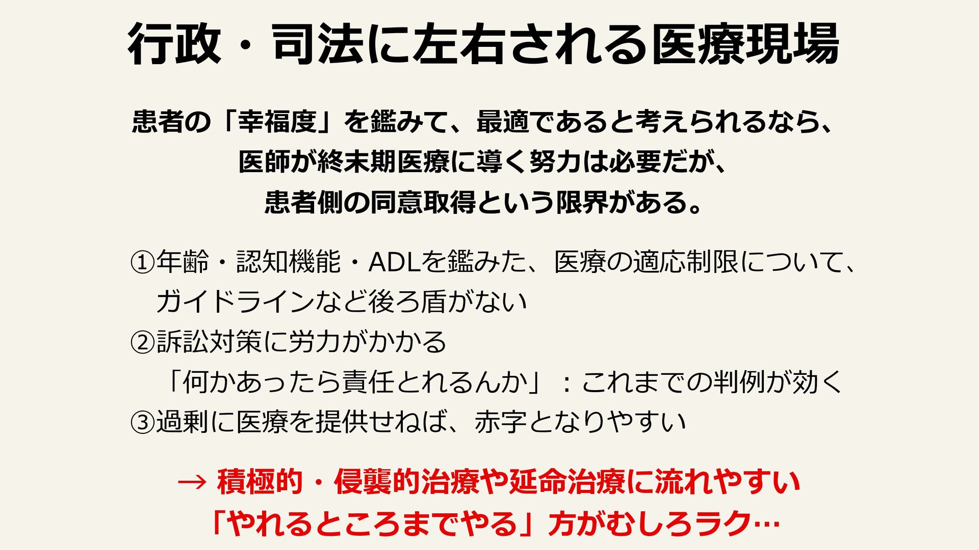 患者の「幸福度」を鑑みて、最適であると考えられるなら、 医師が終末期医療に導く努力は必要だが、 患者側の同意取得という限界がある。 ①年齢・認知機能・ADLを鑑みた、医療の適応制限について、 ガイドラインなど後ろ盾がない ②訴訟対策に労力がかかる 「何かあったら責任とれるんか」:これまでの判例が効く ③過剰に医療を提供せねば、赤字となりやすい → 積極的・侵襲的治療や延命治療に流れやすい