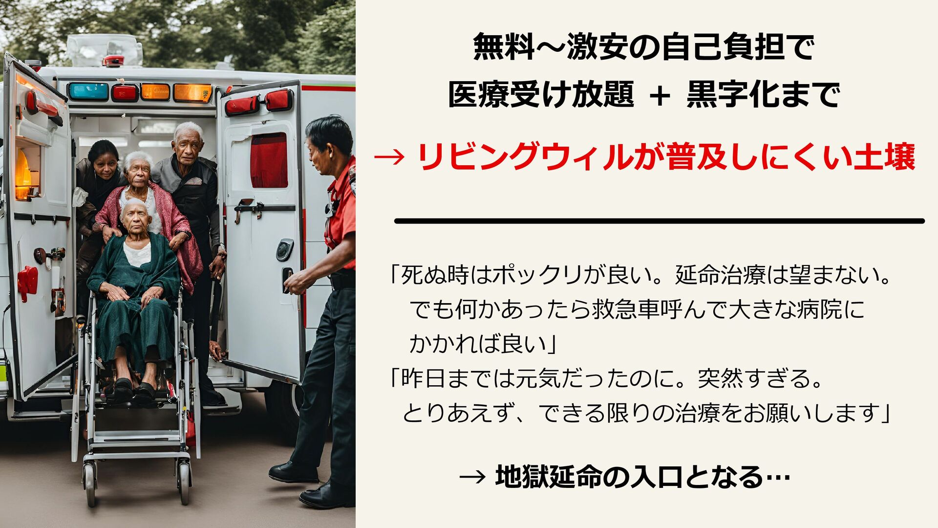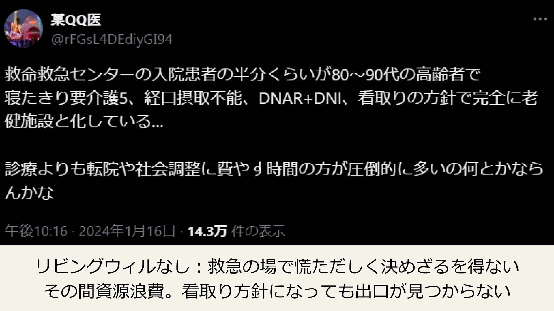 リビングウィルなし:救急の場で慌ただしく決めざるを得ない その間資源浪費。看取り方針になっても出口が見つからない
