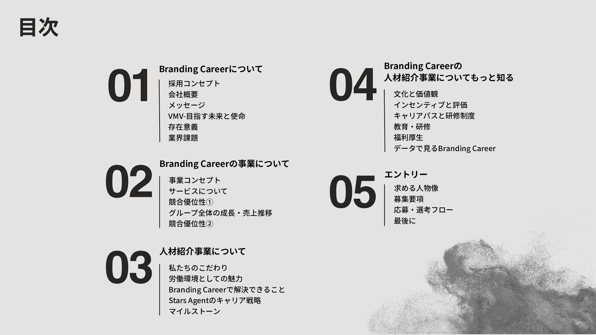 01 事業コンセプト サービスについて 競合優位性① グループ全体の成長・売上推移 競合優位性② Branding Careerの事業について 02 私たちのこだわり 労働環境としての魅力 Branding Careerで解決できること Stars Agentのキャリア戦略 マイルストーン 人材紹介事業について 03 文化と価値観 インセンティブと評価 キャリアパスと研修制度 教育・研修 福利厚生 データで見るBranding Career Branding Careerの 人材紹介事業についてもっと知る 04 求める人物像 募集要項 応募・選考フロー 最後に エントリー 05