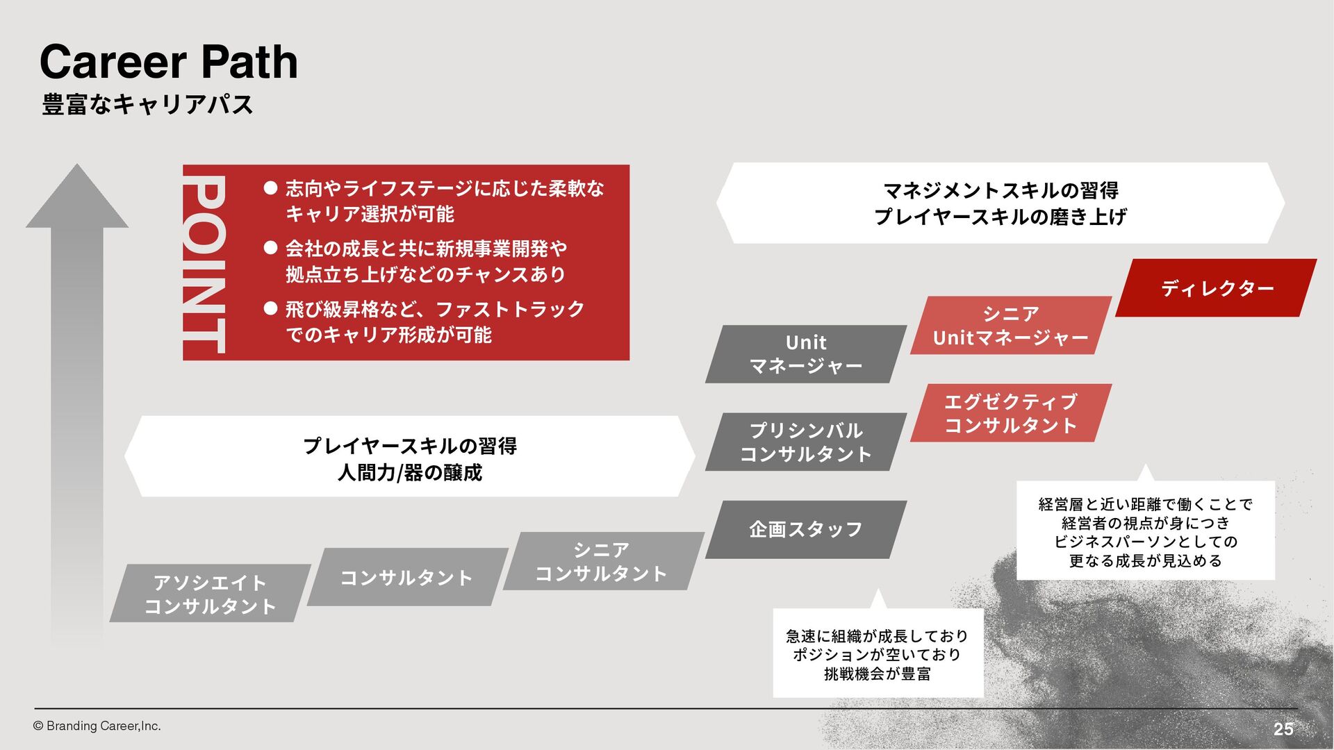 エグゼクティブ コンサルタント シニア コンサルタント コンサルタント アソシエイト コンサルタント ディレクター 経営層と近い距離で働くことで 経営者の視点が身につき ビジネスパーソンとしての 更なる成長が見込める Unit マネージャー シニア Unitマネージャー プレイヤースキルの習得 人間力/器の醸成 マネジメントスキルの習得 プレイヤースキルの磨き上げ • • • POINT © Branding Career,Inc. Career Path 豊富なキャリアパス 急速に組織が成長しており ポジションが空いており 挑戦機会が豊富