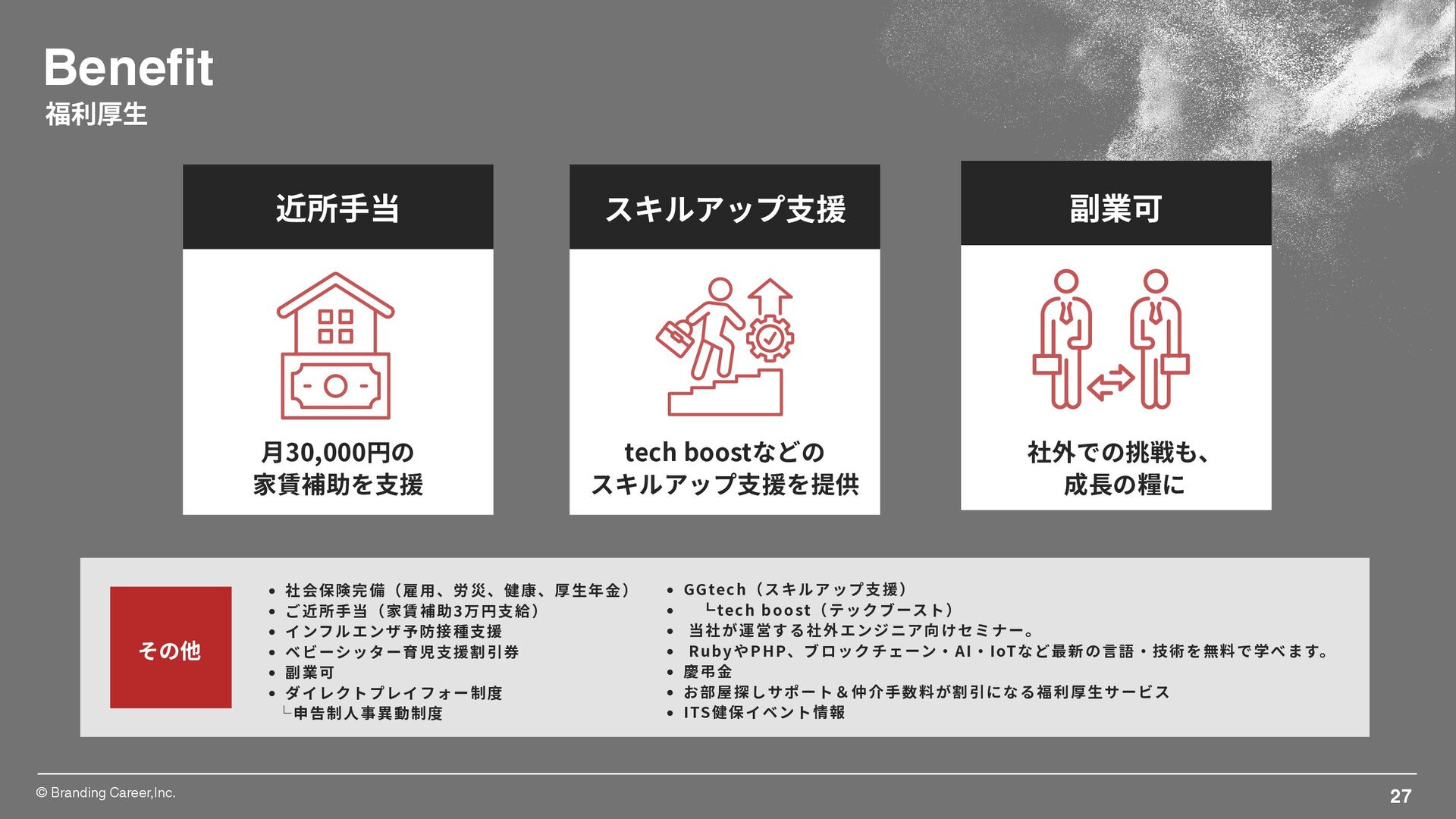 boost(テックブースト) 当社が運営する社外エンジニア向けセミナー。 RubyやPHP、ブロックチェーン・AI・IoTなど最新の言語・技術を無料で学べます。 慶弔金 お部屋探しサポート&仲介手数料が割引になる福利厚生サービス ITS健保イベント情報 その他 月30,000円の 家賃補助を⽀援 tech boostなどの スキルアップ⽀援を提供 社外での挑戦も、 成長の糧に 近所手当 スキルアップ支援 副業可 © Branding Career,Inc. Benefit 福利厚生