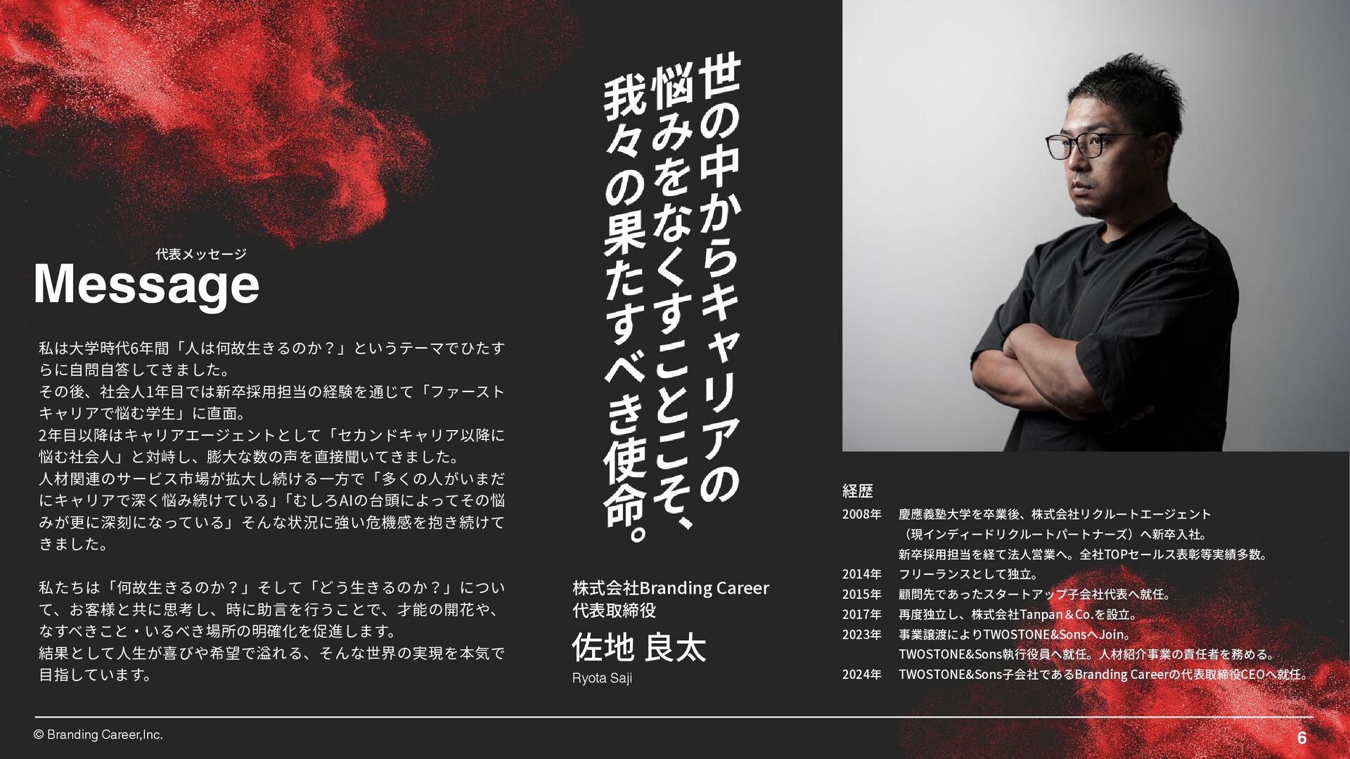 人材関連のサービス市場が拡大し続ける一方で「多くの人がいまだ にキャリアで深く悩み続けている」 「むしろAIの台頭によってその悩 みが更に深刻になっている」そんな状況に強い危機感を抱き続けて きました。 私たちは「何故生きるのか?」そして「どう生きるのか?」につい て、お客様と共に思考し、時に助言を行うことで、才能の開花や、 なすべきこと・いるべき場所の明確化を促進します。 結果として人生が喜びや希望で溢れる、そんな世界の実現を本気で 目指しています。 株式会社Branding Career 代表取締役 佐地 良太 Ryota Saji 経歴 2008年 2014年 2015年 2017年 2023年 2024年 慶應義塾大学を卒業後、株式会社リクルートエージェント (現インディードリクルートパートナーズ)へ新卒入社。 新卒採用担当を経て法人営業へ。全社TOPセールス表彰等実績多数。 フリーランスとして独立。 顧問先であったスタートアップ子会社代表へ就任。 再度独立し、株式会社Tanpan&Co.を設立。 事業譲渡によりTWOSTONE&SonsへJoin。 TWOSTONE&Sons執行役員へ就任。人材紹介事業の責任者を務める。 TWOSTONE&Sons子会社であるBranding Careerの代表取締役CEOへ就任。 © Branding Career,Inc.