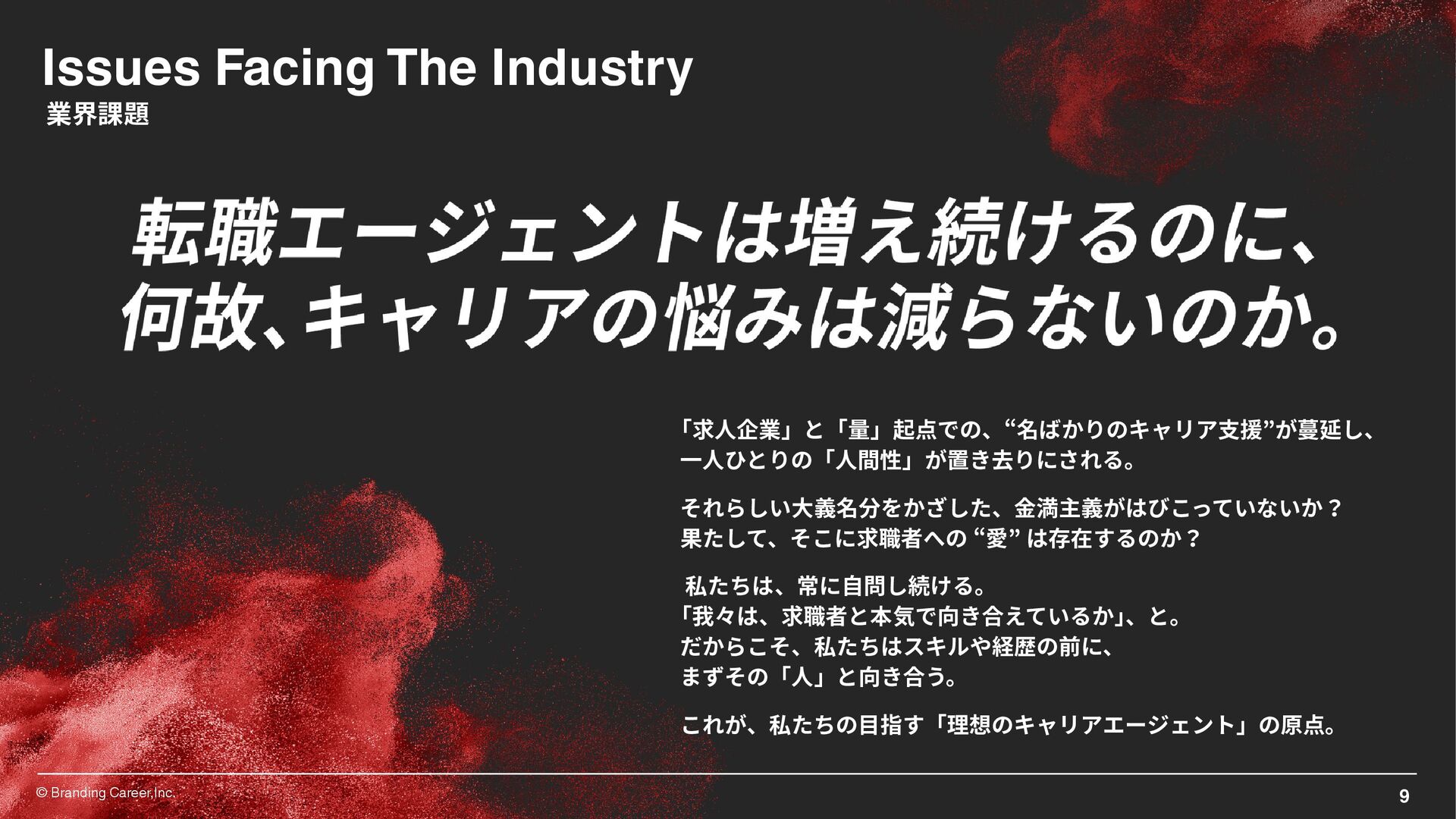 9 Issues Facing The Industry 業界課題 「求人企業」と「量」起点での、“名ばかりのキャリア支援”が蔓延し、 一人ひとりの「人間性」が置き去りにされる。 それらしい大義名分をかざした、金満主義がはびこっていないか? 果たして、そこに求職者への