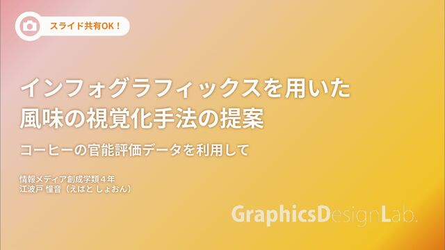 インフォグラフィックスを⽤いた ⾵味の視覚化⼿法の提案 コーヒーの官能評価データを利⽤して 情報メディア創成学類4年 江波⼾ 憧⾳(えばと しょおん) スライド共有OK!